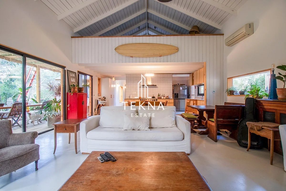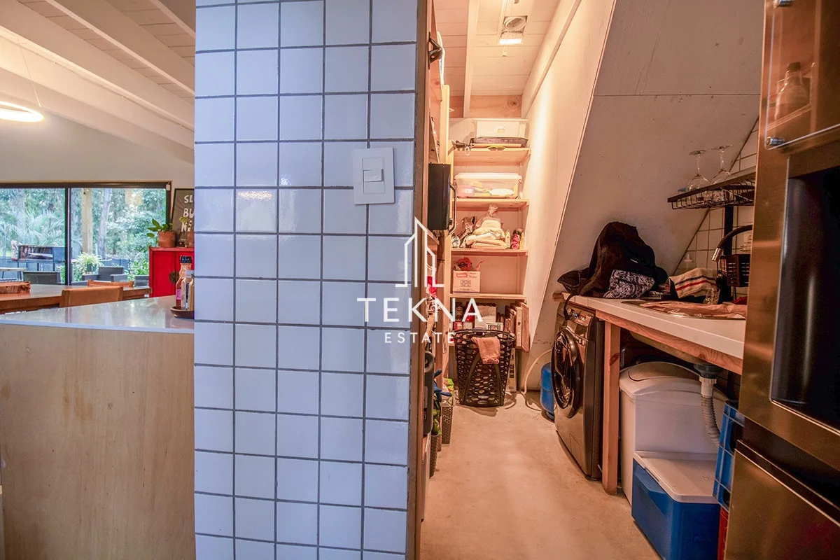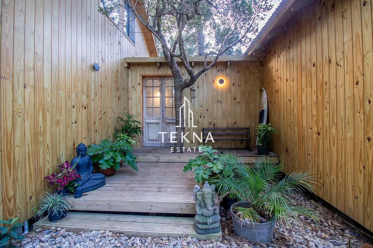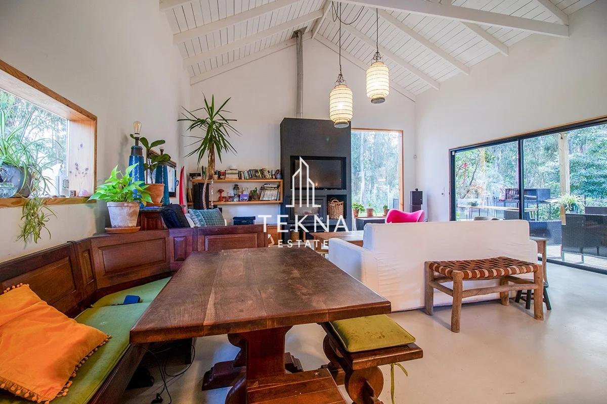Se distribuye en dos plantas, en planta baja se encuentra su living comedor que constituye el espacio mas amplio de la propiedad,. La cocina integrada pero también super amplia, con gran espacio de guardado. Saliendo por el living se encuentra un amplio deck de madera techado, super comodo, con parrilla movil y piscina, que se combina con la naturaleza del lugar y forman un espacio increíble para pasar en familia.