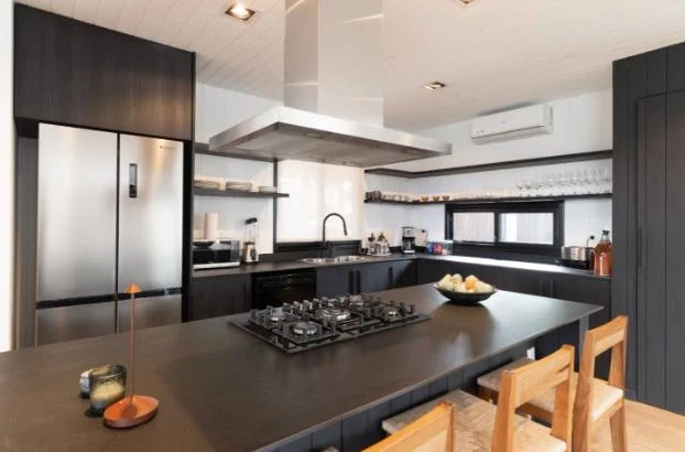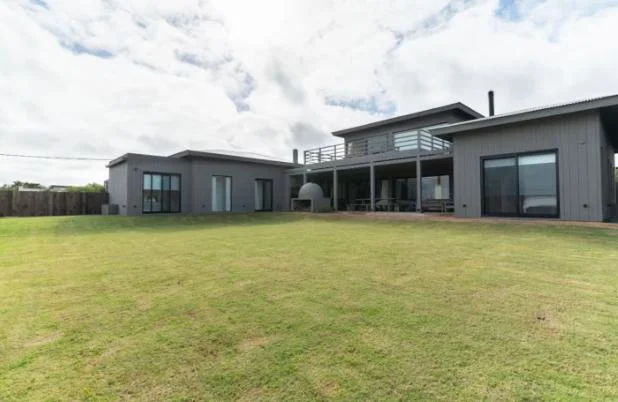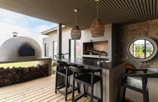The house features a living and dining area with access to the deck, where you’ll find a barbecue, clay oven, and outdoor countertop.