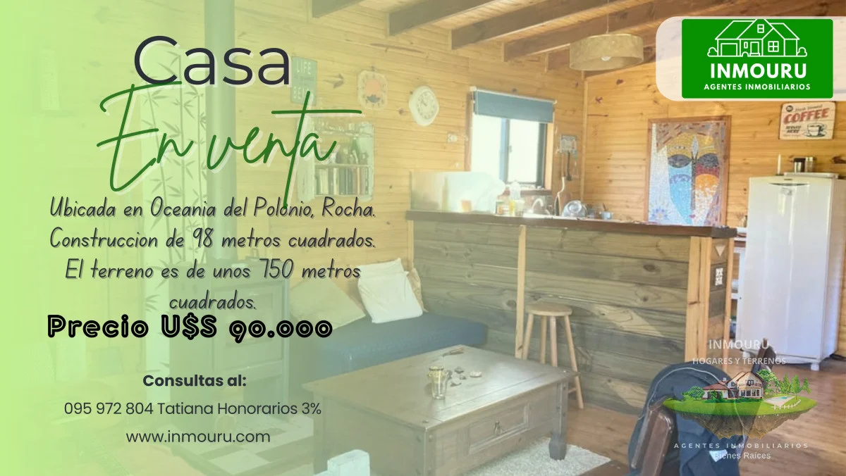 Venta de Casa en Oceanía del Polonio, Rocha Precio U$S 90.000 Cuenta con una construcción de 98 metros cuadrados. Con 1 dormitorio, living comedor con cocina integrada, baño. Tiene un deck con sillones para disfrutar de la naturaleza. El terreno es de 750 metros cuadrados. La casa esta ubicada a 400 metros de la playa. Honorarios 3% Agente Tatiana Referencia Interna : Tera-2019