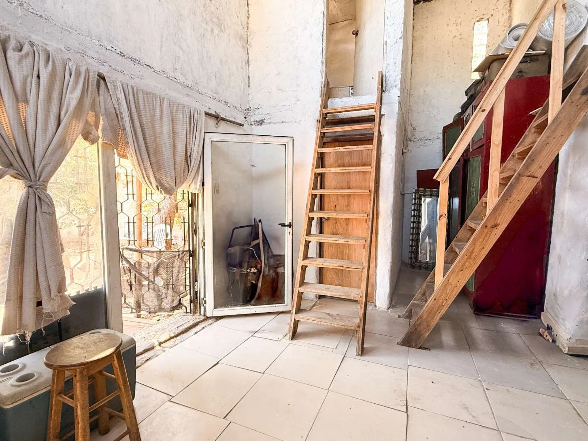 La propiedad cuenta con 84 m² construidos sobre un terreno de 555 m². Se desarrolla en dos plantas y dispone de tres dormitorios, dos de ellos en planta alta con acceso por escalera y uno en planta baja.