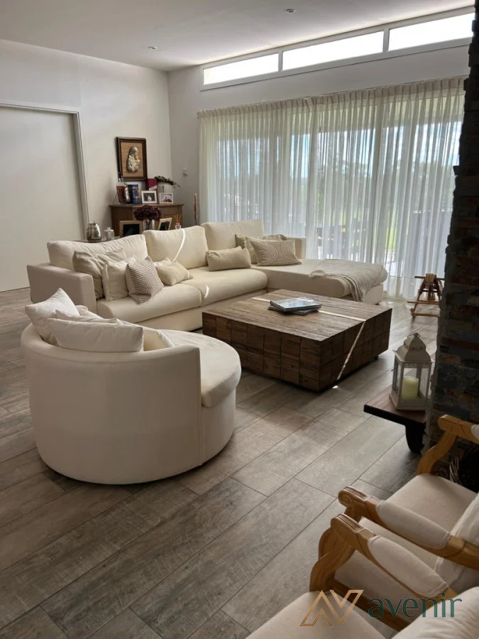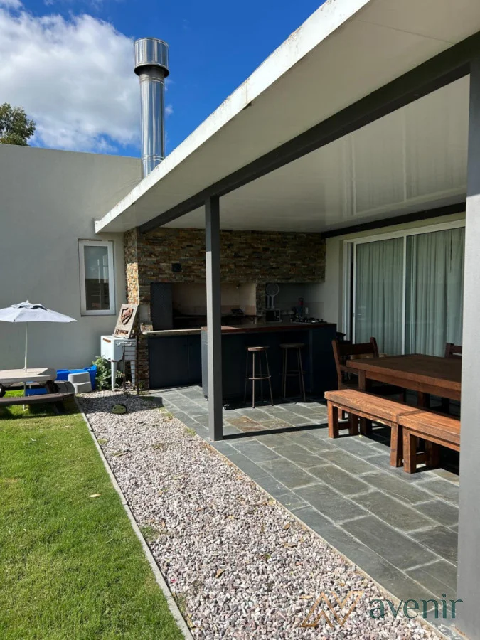 Al ingresar al lote se accede a un espacio techado para 2 autos y gran puerta doble que conduce a un amplio living con estufa a leña tradicional y ventanales amplios que dan al fondo verde y soleado. Toilette cómodo para visitas.