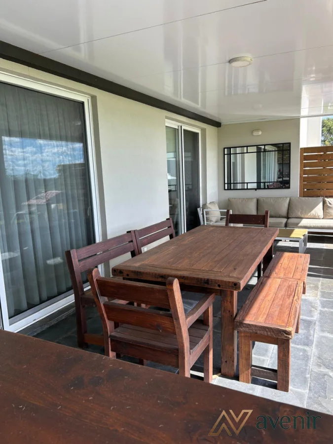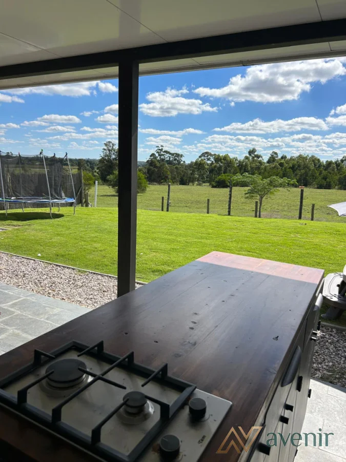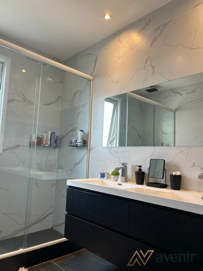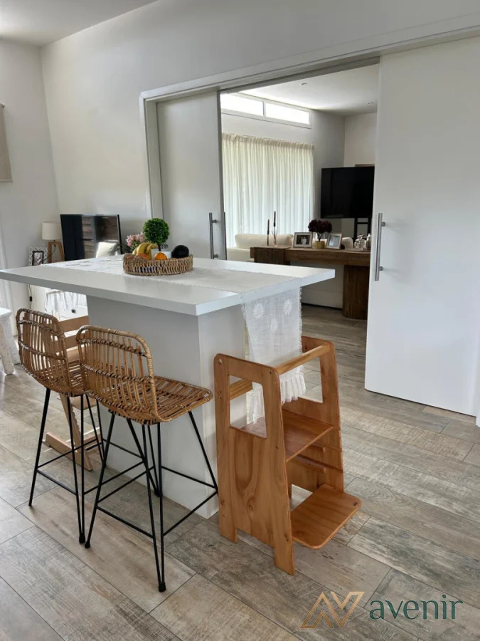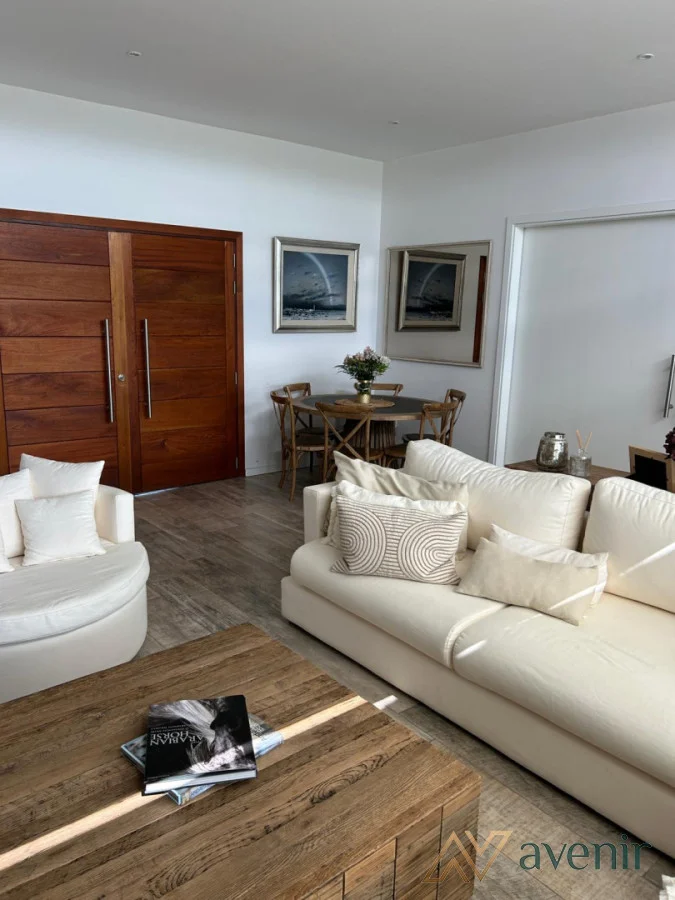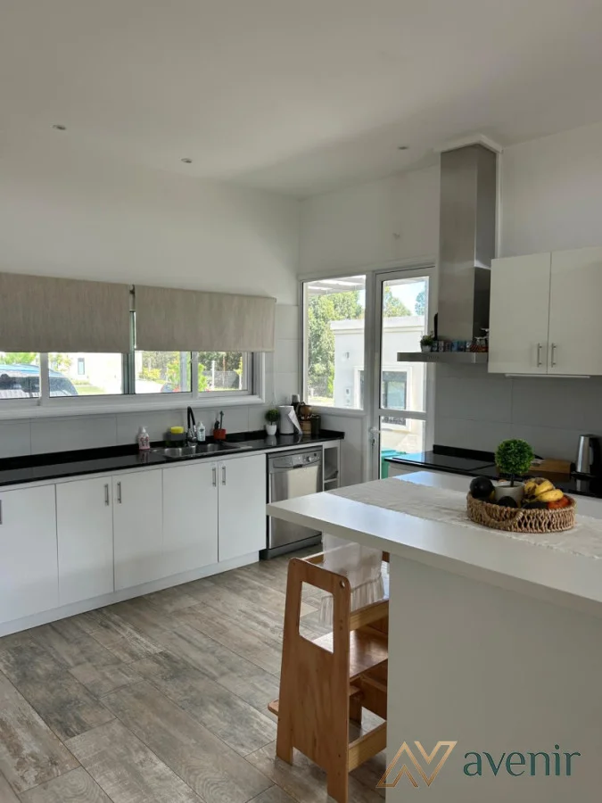 A la izquierda, separado por puerta corrediza, se encuentra la cocina luminosa con amplias mesadas e isla central. Al fondo, lavadero y cuarto de servicio completo.