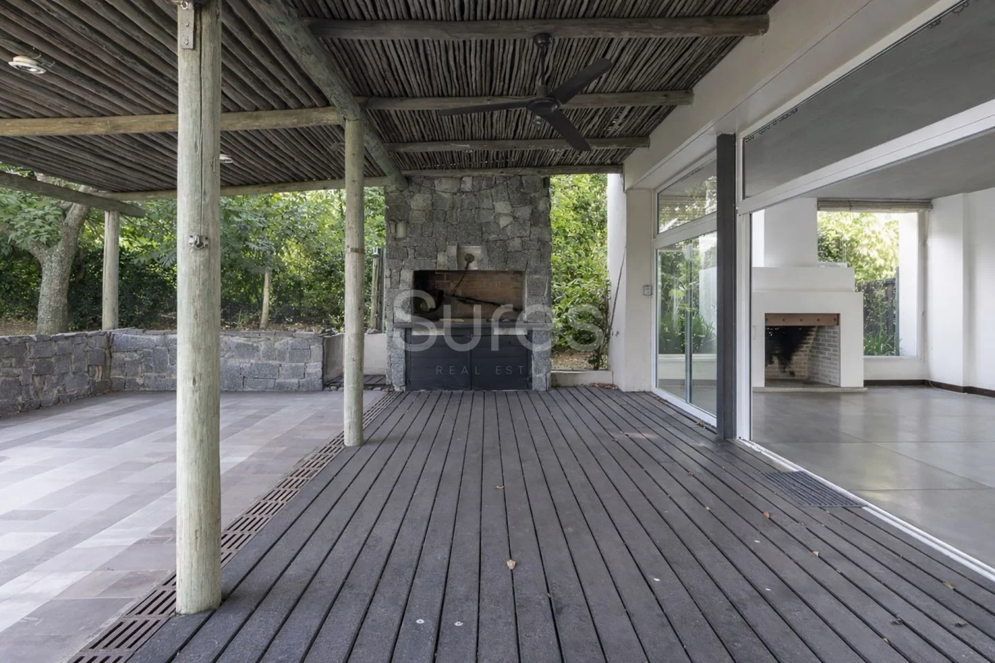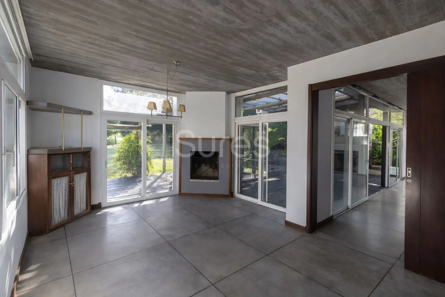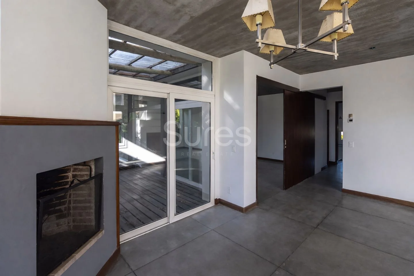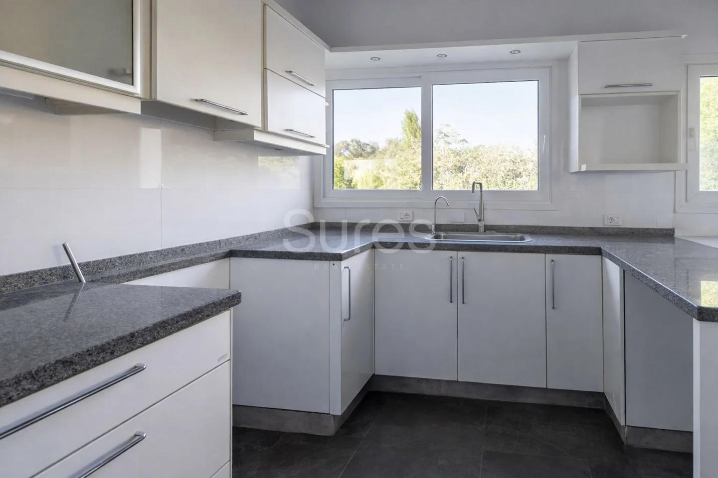 Al ingresar, la casa recibe con un hall de entrada que conecta con el living comedor con estufa a leña, generando un espacio central cómodo para el día a día y también para reuniones. En planta baja cuenta además con toilette, comedor con ventanales de piso a techo, y un estar con salida directa a la galería. La cocina con office ofrece buen funcionamiento diario y se complementa con despensa y lavadero. En este nivel también se ubican el dormitorio de servicio y su baño.