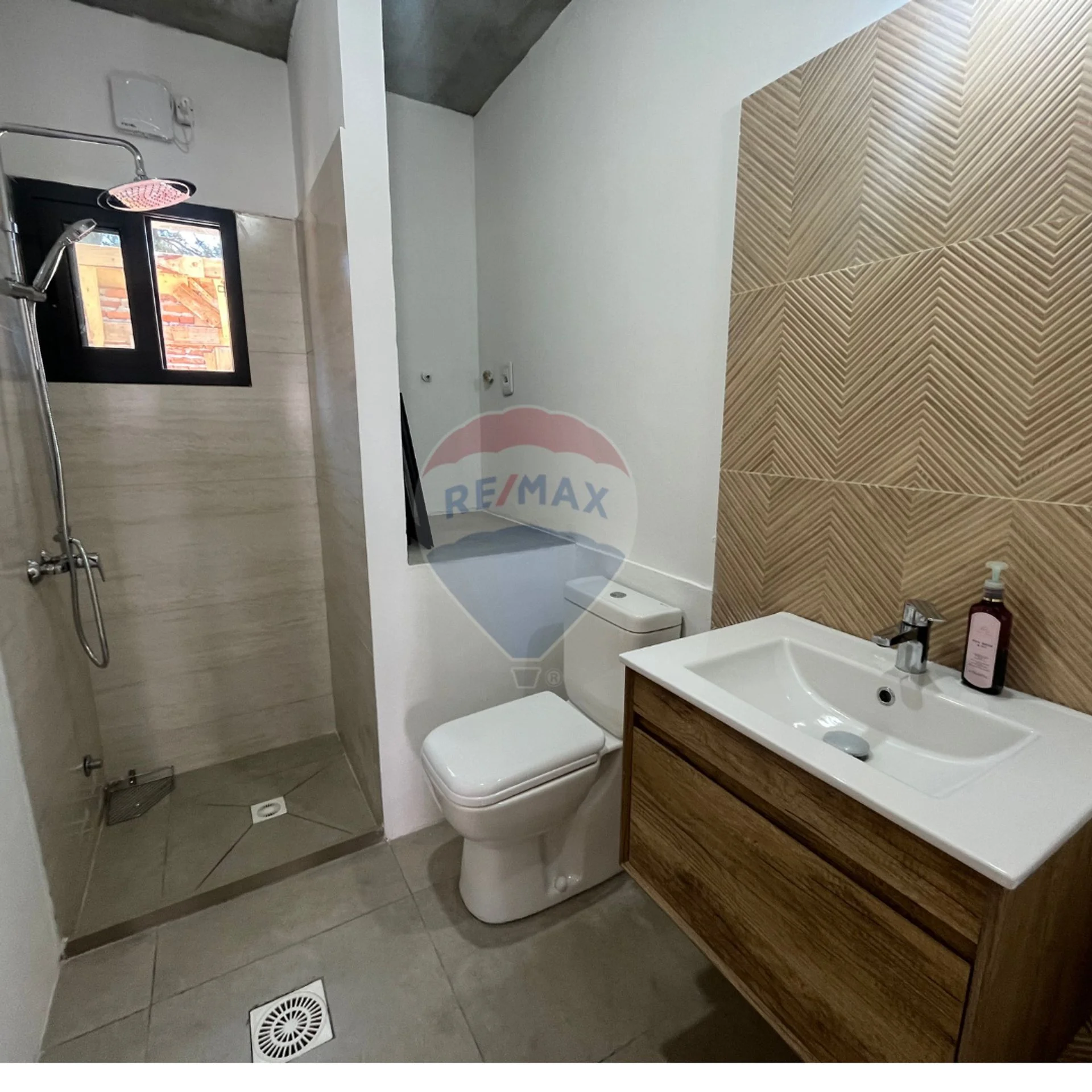 Baño completo de estilo moderno con espacio para colocar la lavadora y con las conexiones para colocar calefón y extractor.
