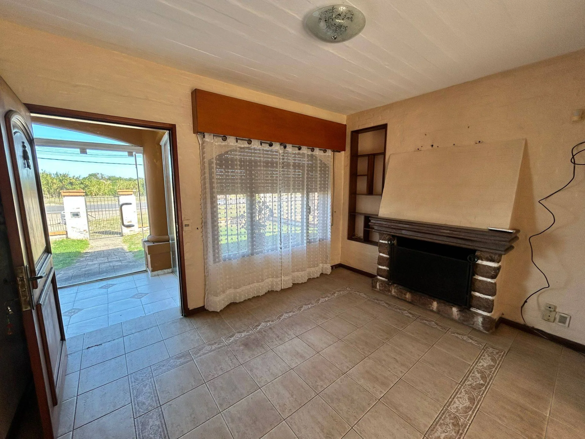 Living con estufa a leña, baño social, cocina equipada integrada con gran comedor.