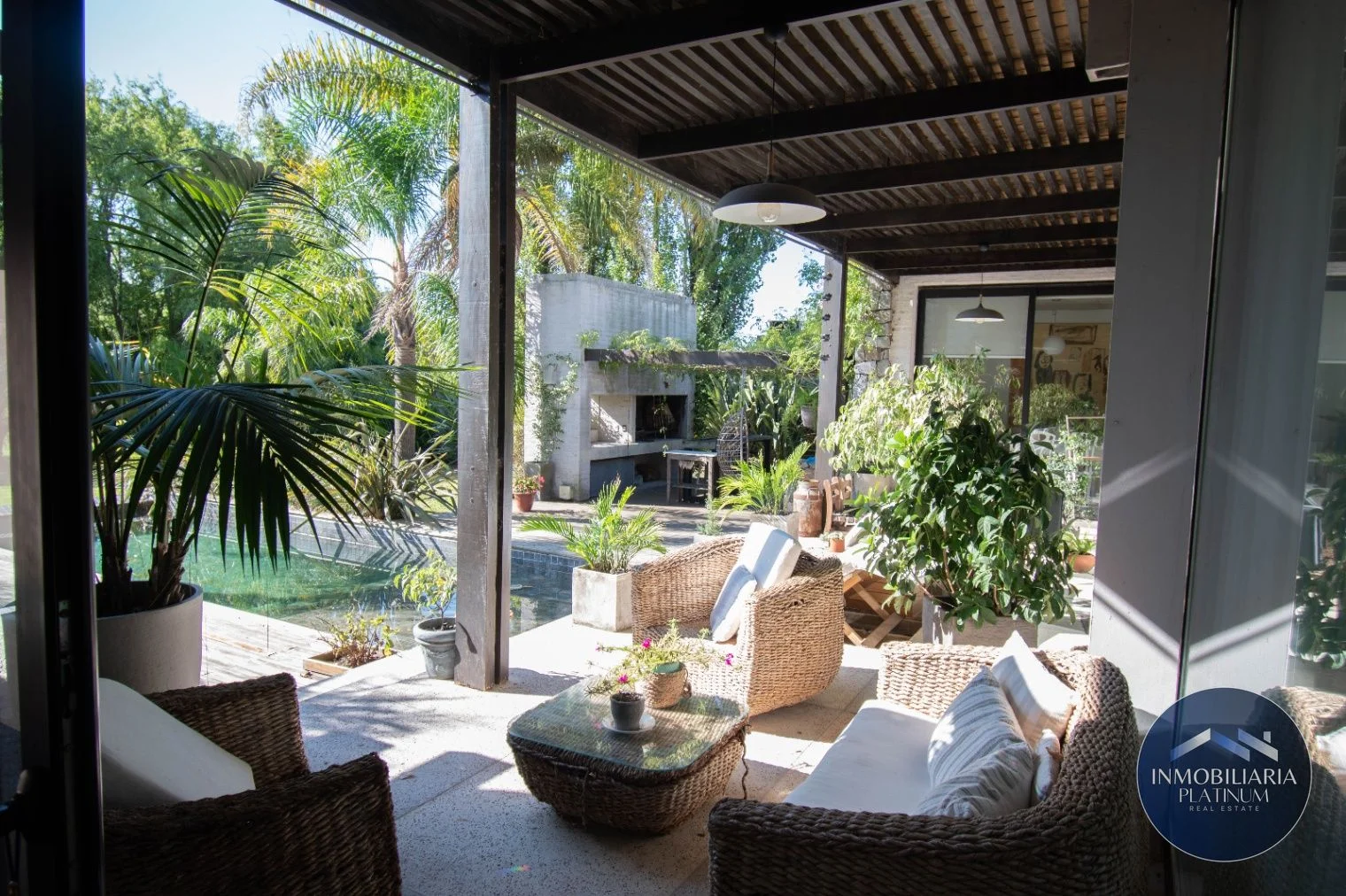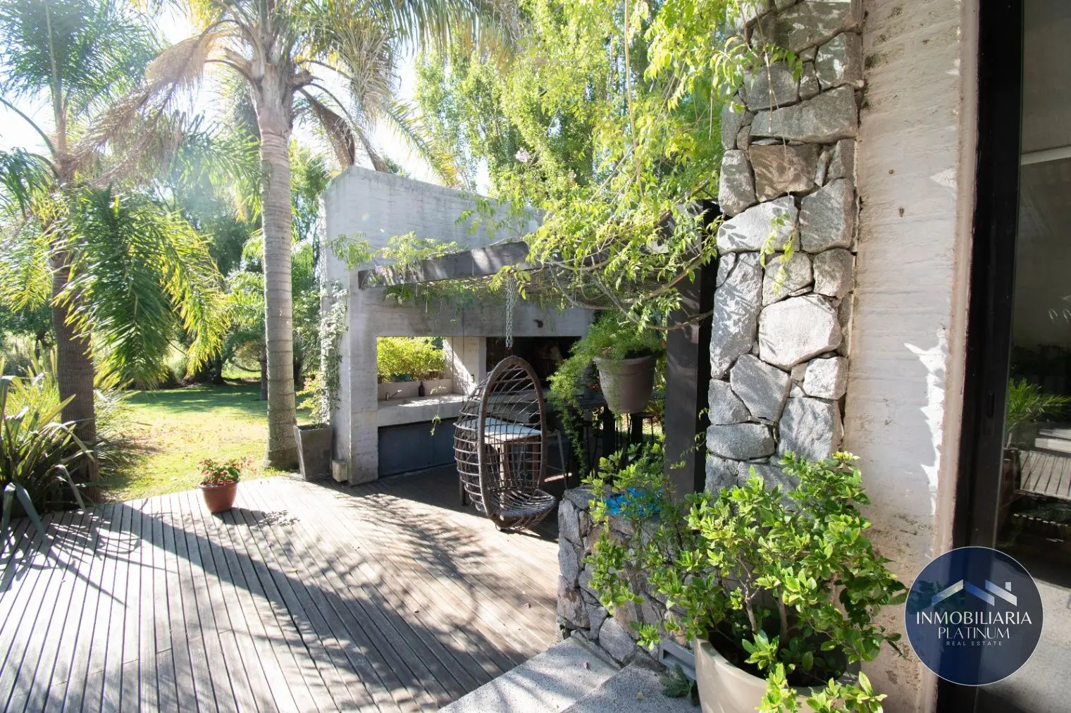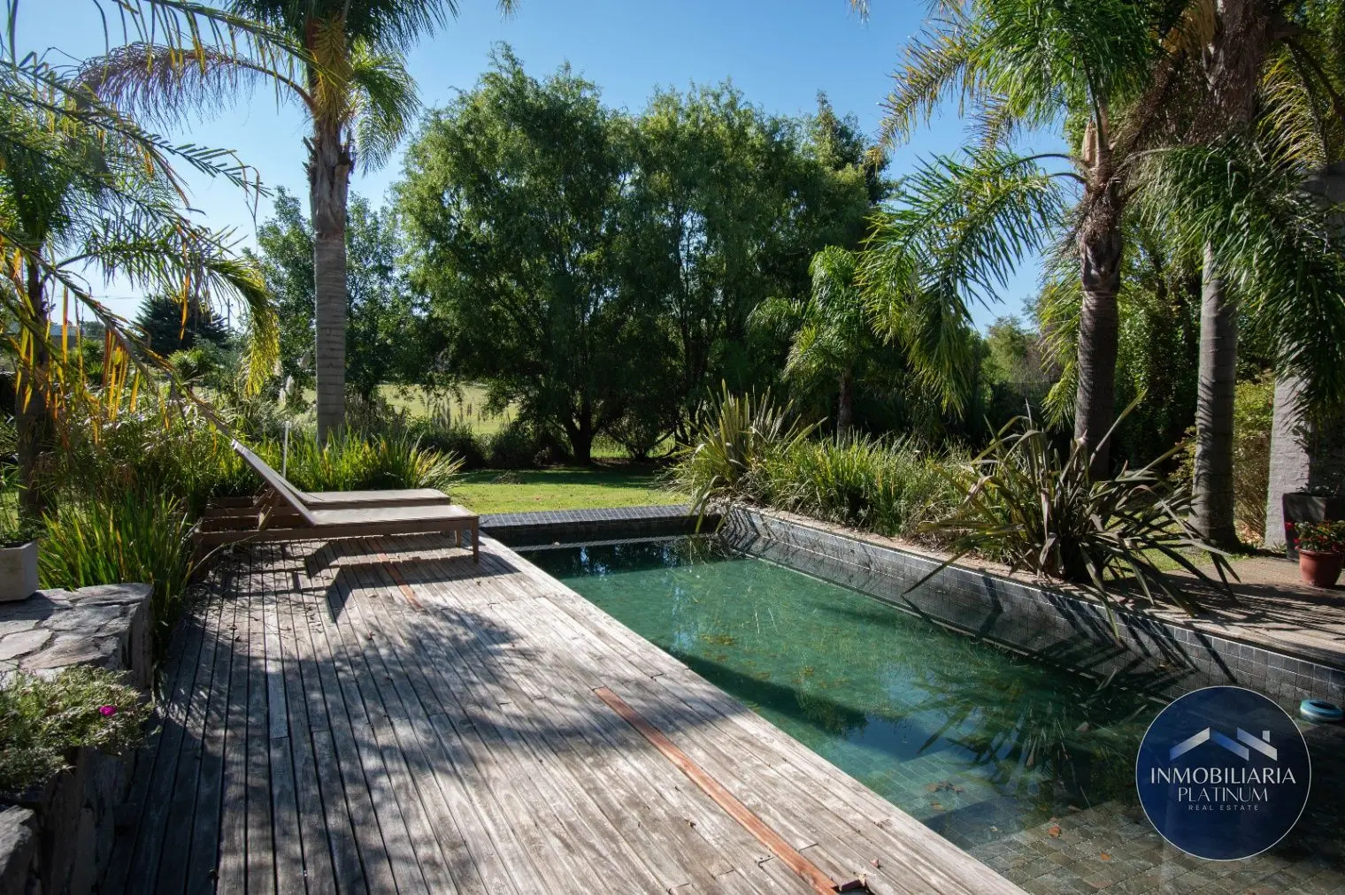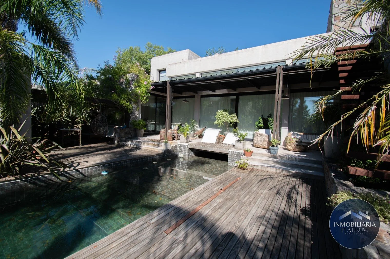 - La parte exterior trasera cuenta con una gran galería en deck de piso tradicional, con reposeras de madera que se integran a la piscina, junto a una buena barbacoa.