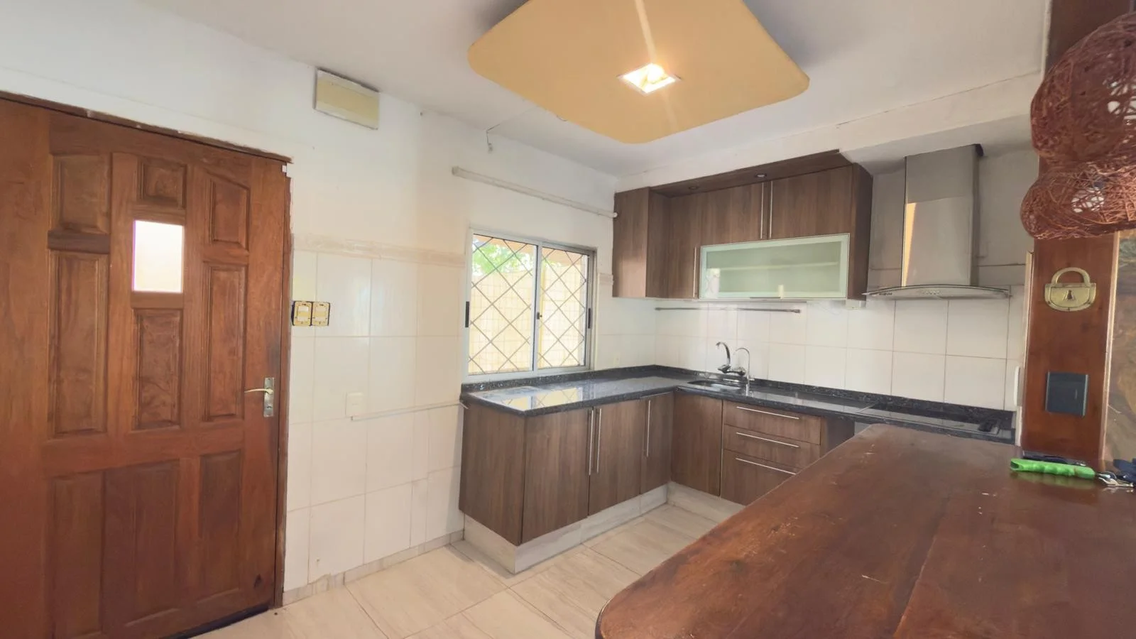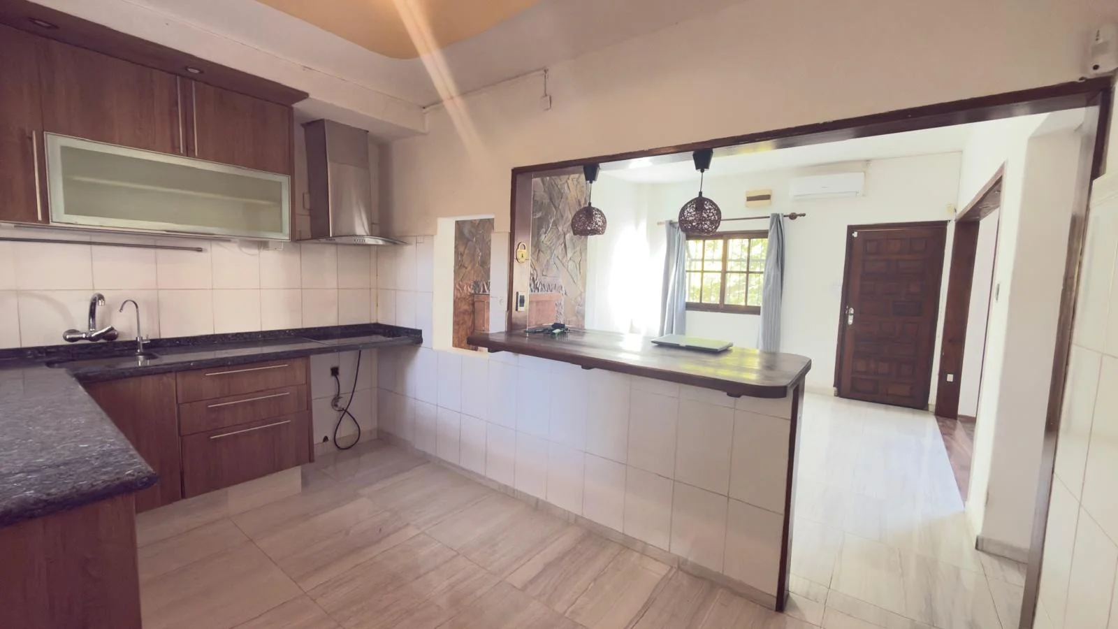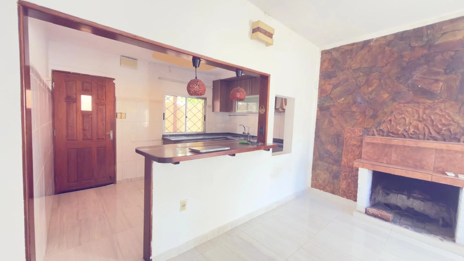 Al ingresar, living comedor equipado con estufa a leña. La cocina integrada, con una práctica barra desayunadora , buen espacio de almacenamiento, mesada de granito, anafe empotrado y campana,comedor diario. salida al patio con parrillero, pergola, espacio para tender ropa