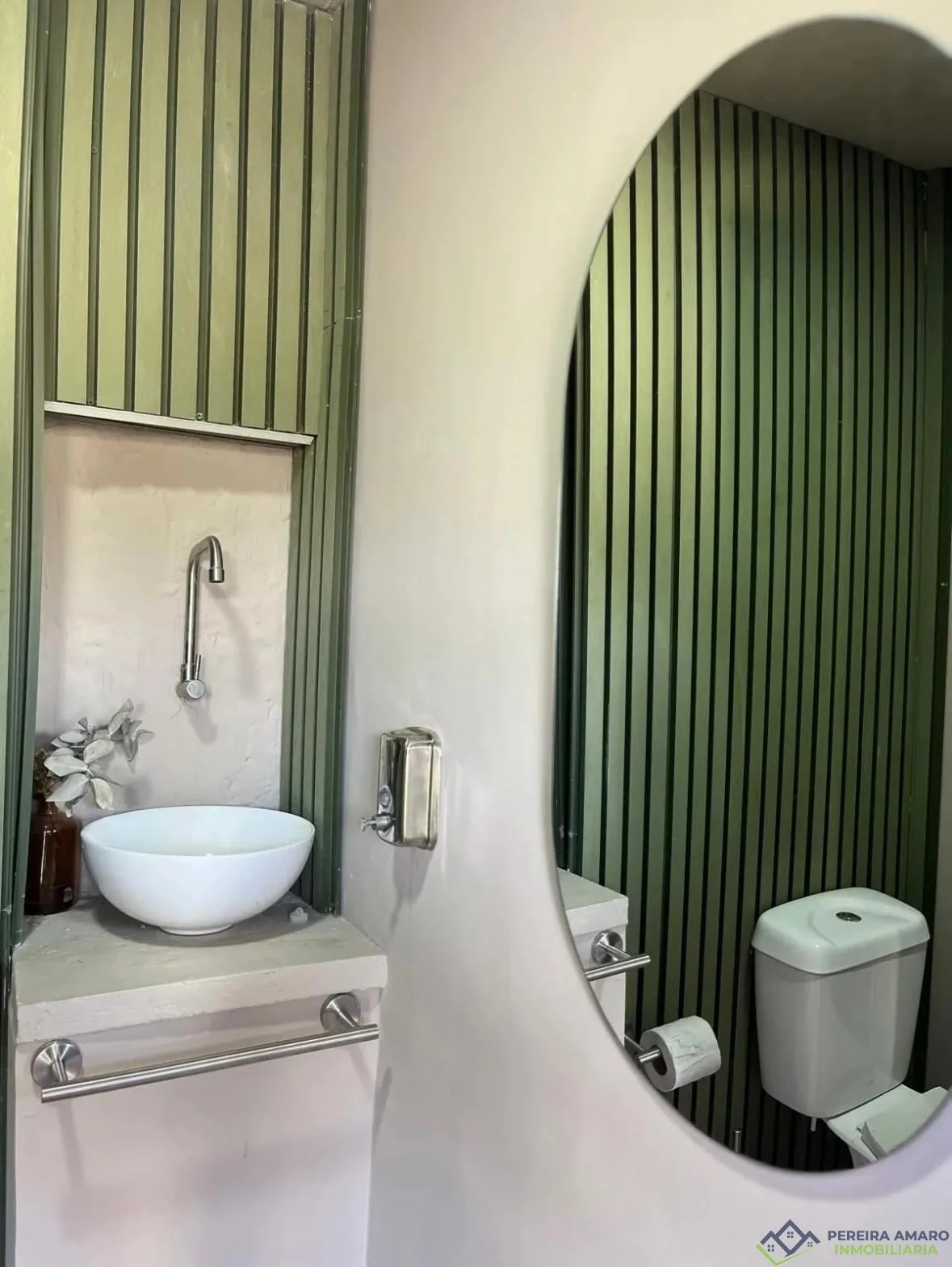 El baño presenta un diseño contemporáneo, con bacha sobre mueble, mampara, extractor y ventana vaivén que aporta luz natural.
