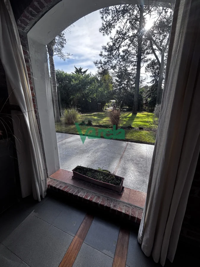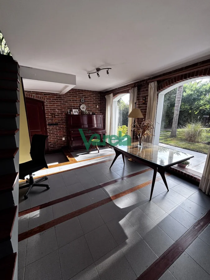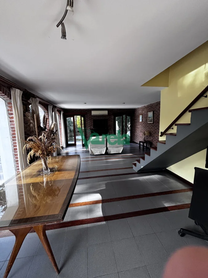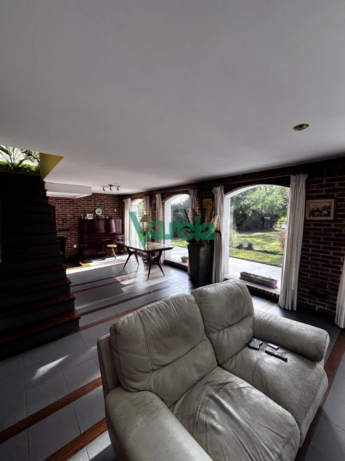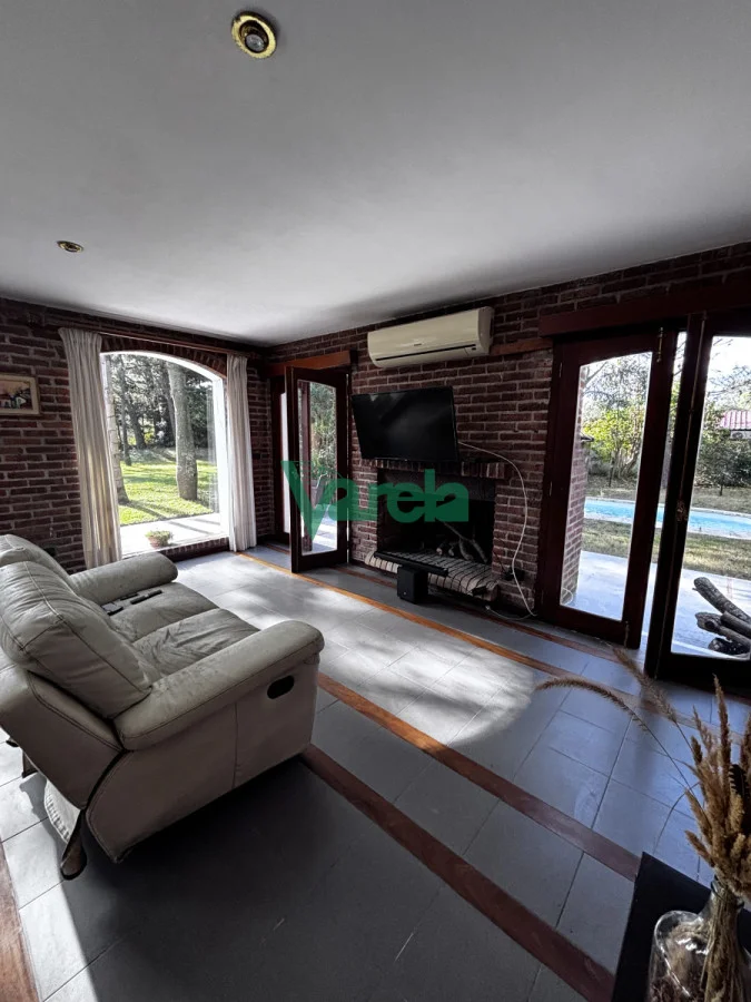 Living comedor amplio, con estufa a leña, pisos de cerámica y detalles en maderas nobles (lapacho y cedro).