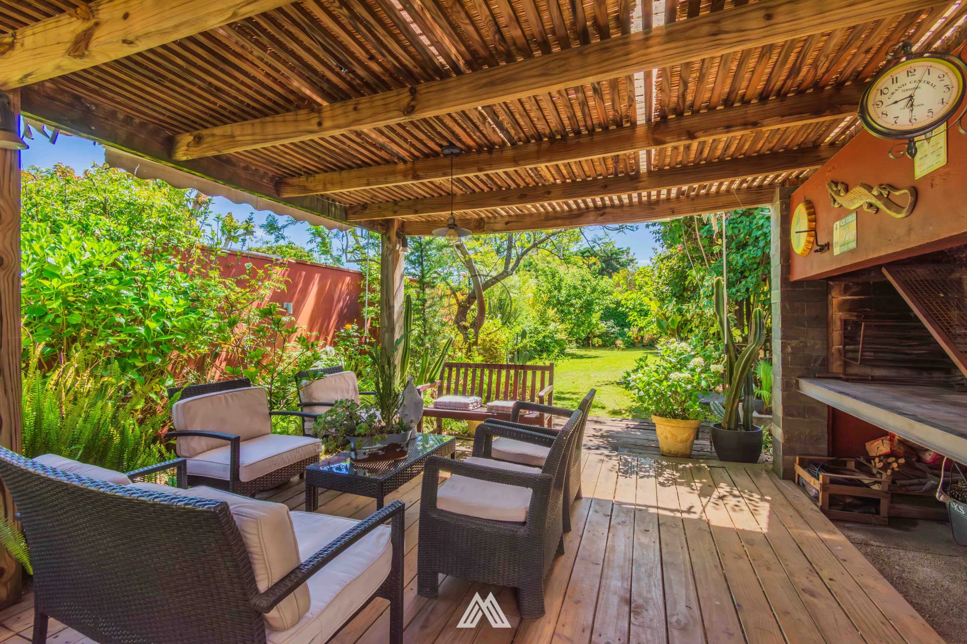 * Pérgola con parrillero de 24 m² rodeada de plantas