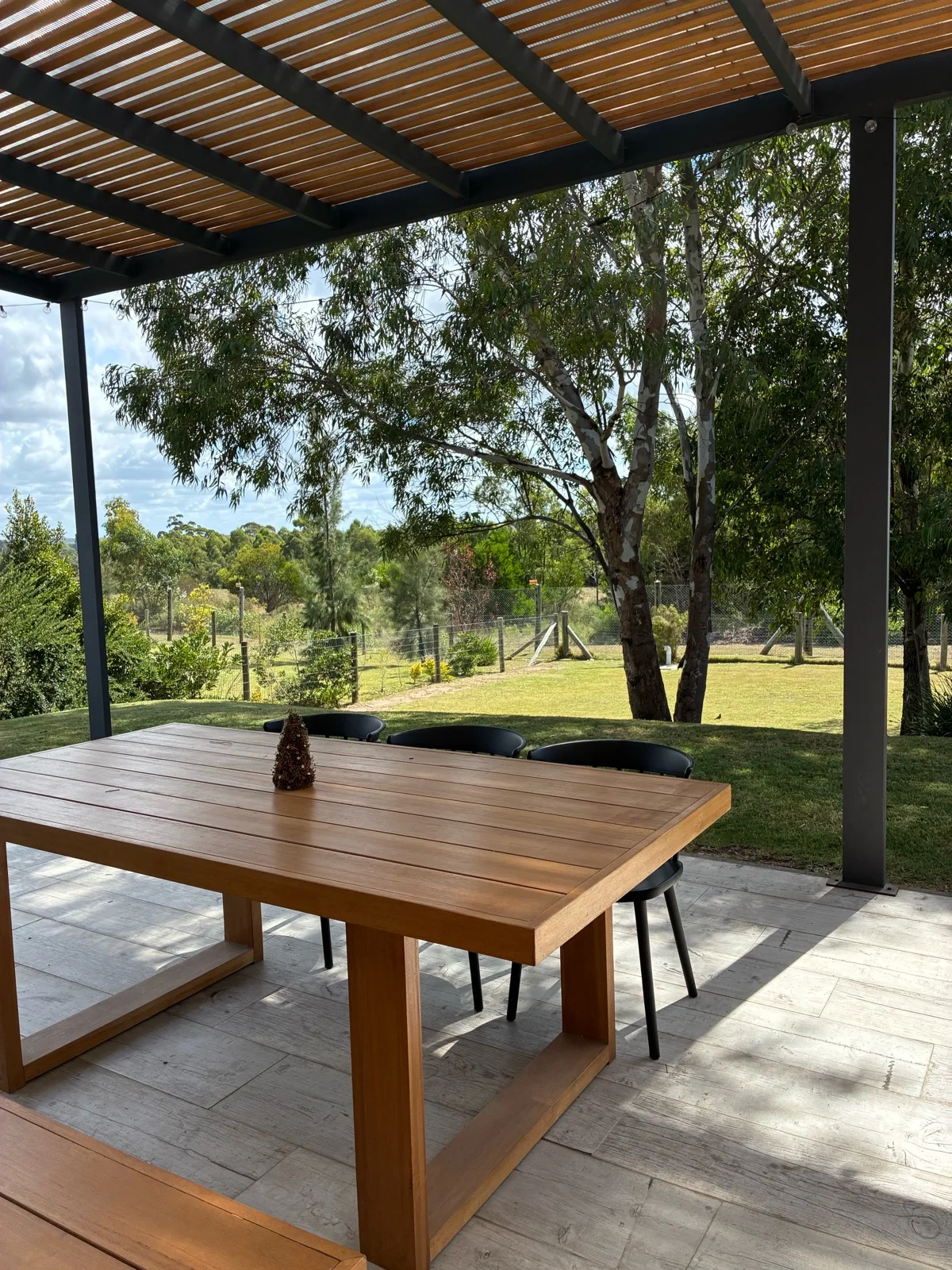 Cuenta con gran pérgola techada de hierro con alfajías de madera y fondo con orientación norte y vista despejada al bosque. Gran jardín.