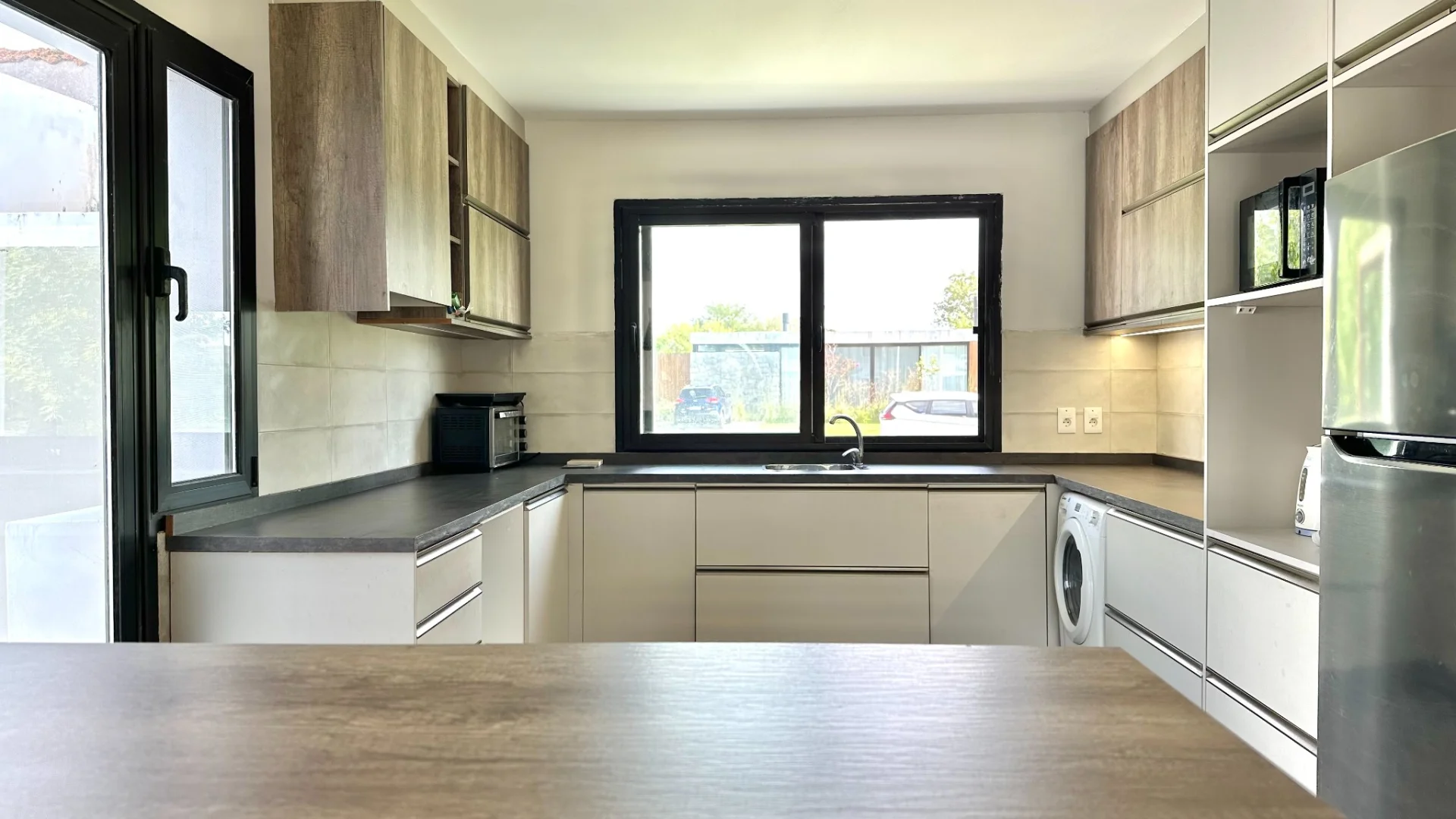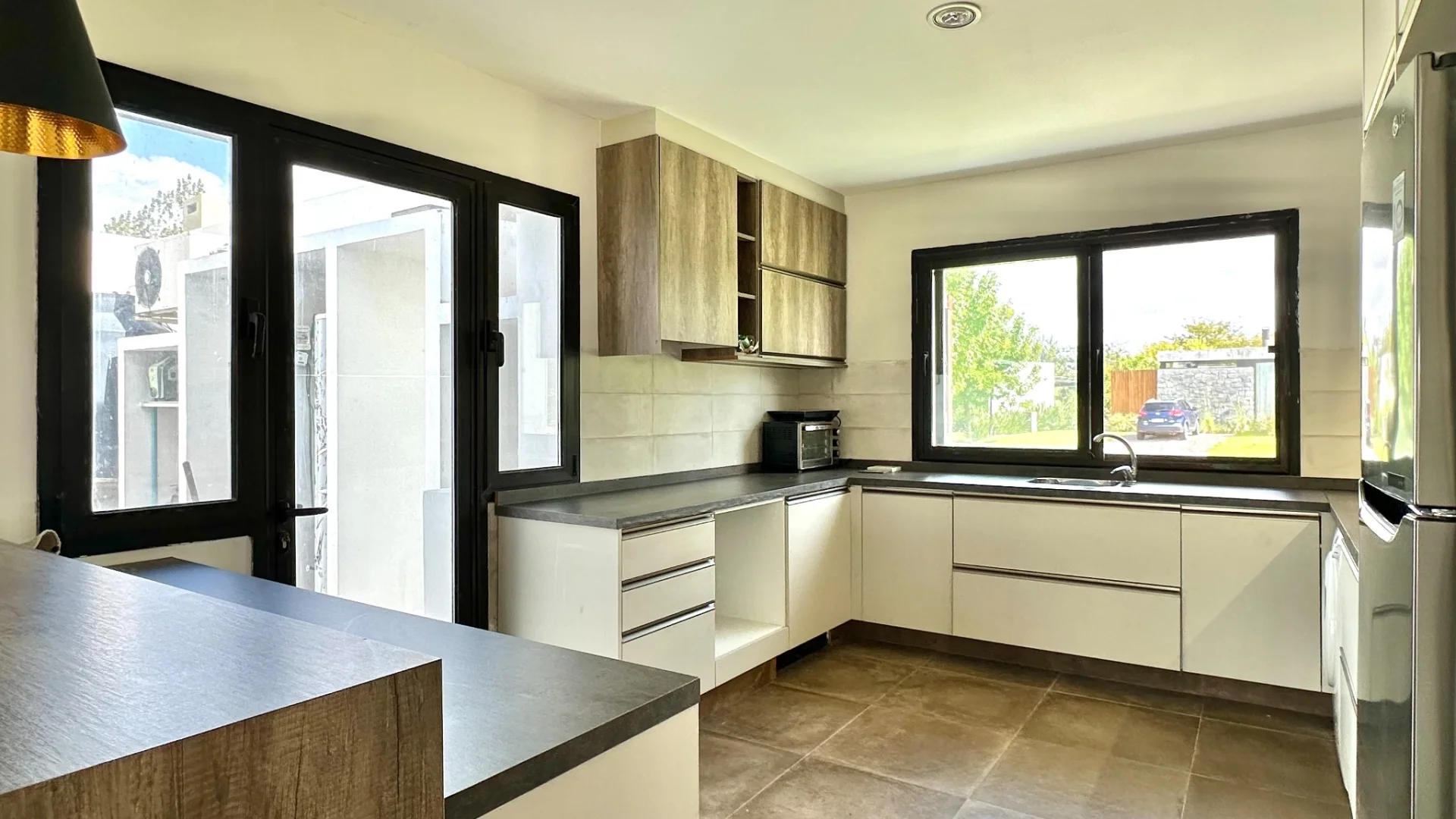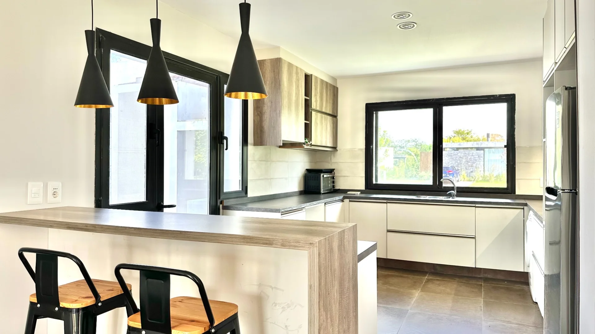 Cocina semi integrada con barra. Estar diario con salida directa al jardín.