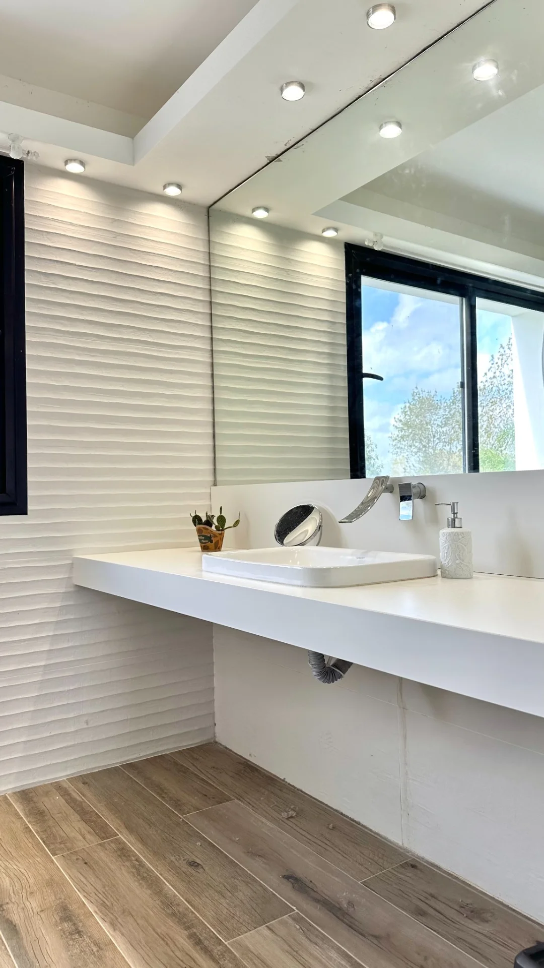 En la planta de abajo, nos encontramos con el hall de distribuición que nos lleva a un gran living comedor con estufa de alto rendimiento y grandes ventanales con salida hacia el jardín.