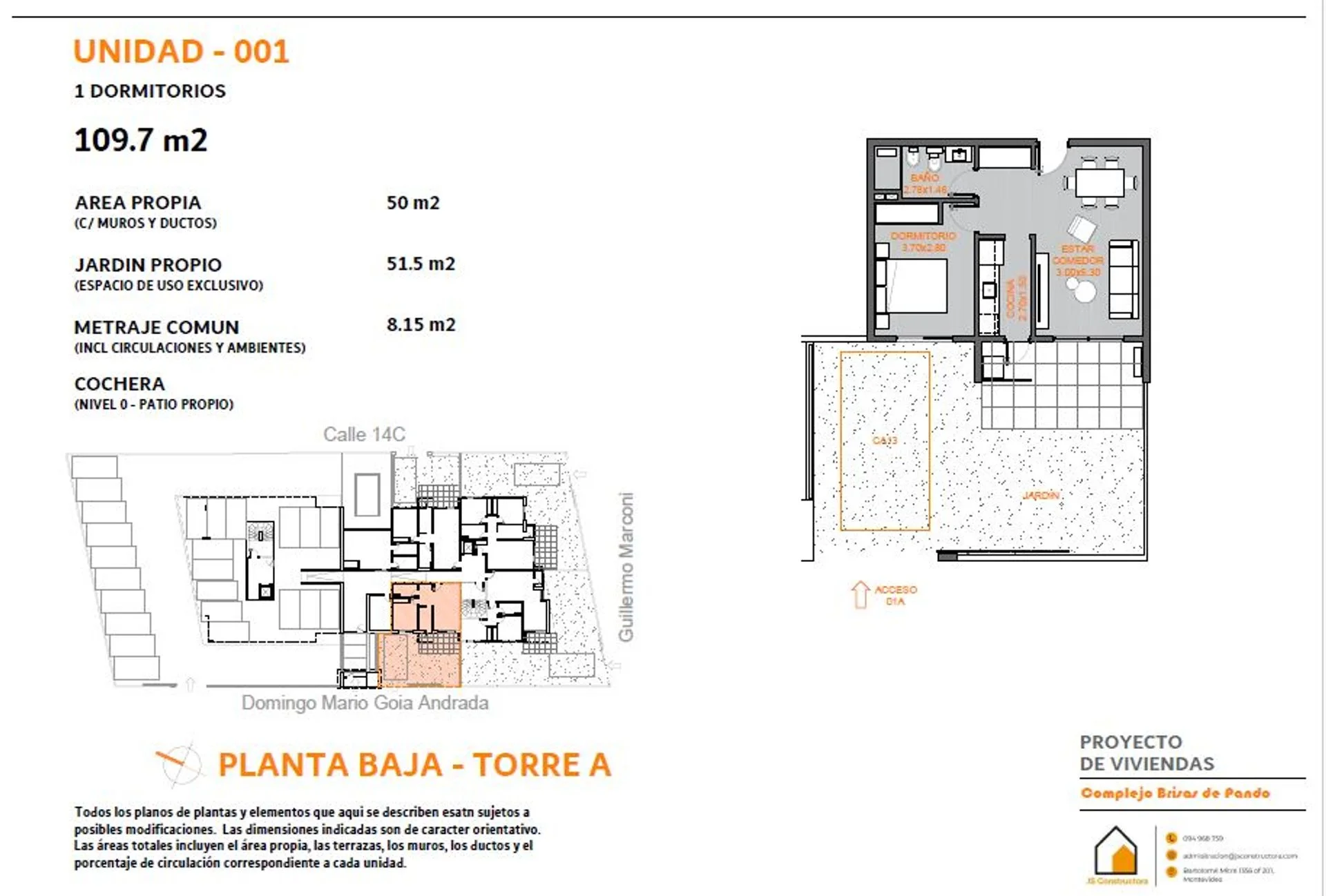La unidad 001 de la torre A, está ubicada en planta baja, cuenta con 50m² propios de apartamento (living, cocina comedor, lavadero, baño y un dormitorio), 51,5m² de jardín de uso exclusivo con cochera, ingreso directo, independiente desde la calle mediante portones automatizados.
