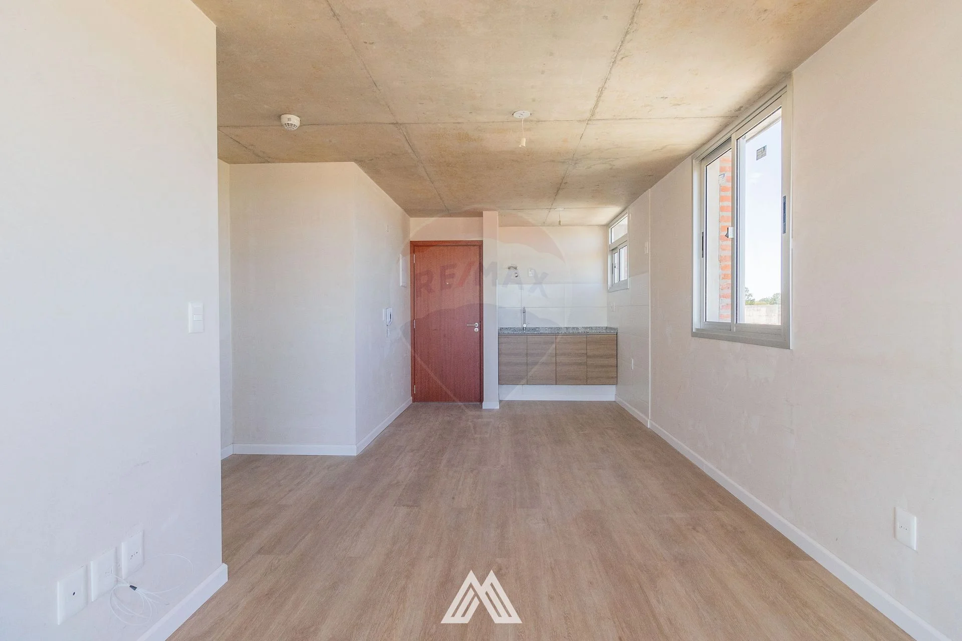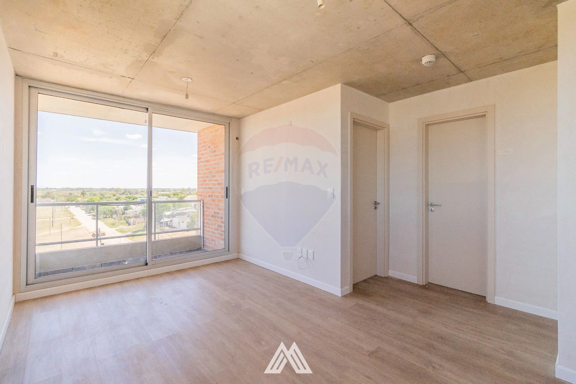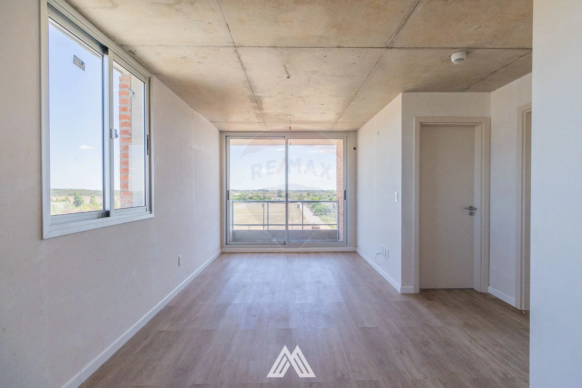 Cocina integrada con living comedor y acceso al balcón con ventanal de techo a piso.