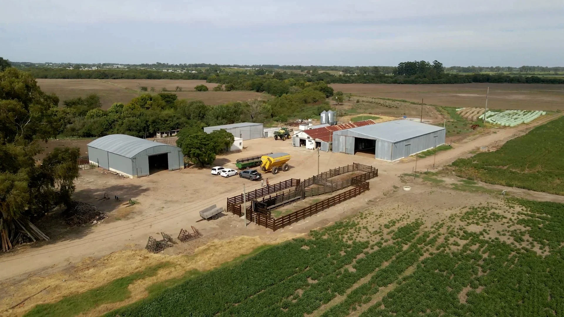 Las instalaciones de trabajo están en muy buen estado, con vacunos y lanares. En uno de los padrones hay 4 galpones para depósito y maquinaria con fosa de ordeñe, patio de comidas, bebederos y molinos de reserva, y 3 casas en diferente estado de conservación.