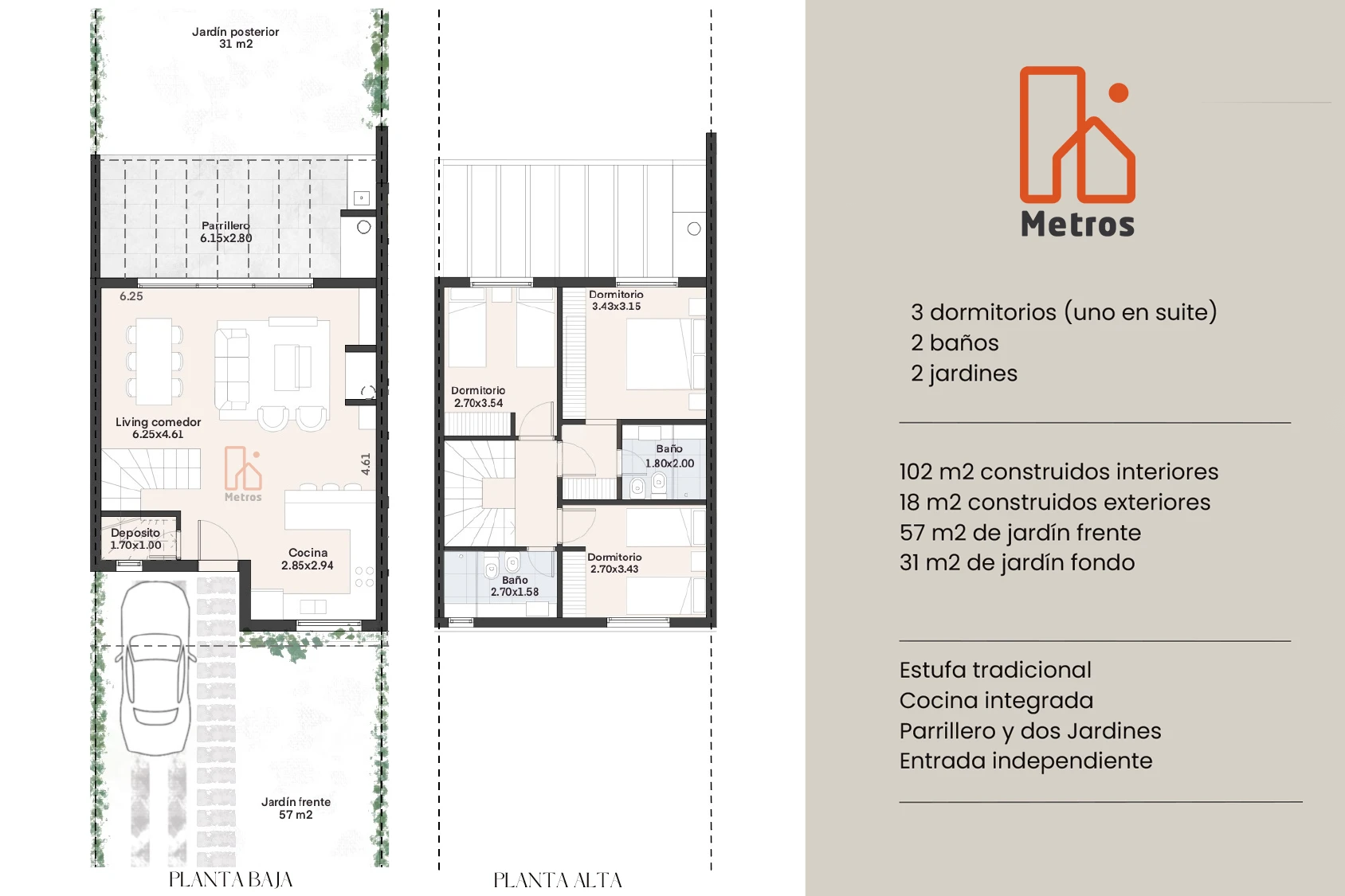3 dormitorios, el principal en suite • 2 baños • Jardín al frente y al fondo • parrillero • depósito • cochera para 2 autos