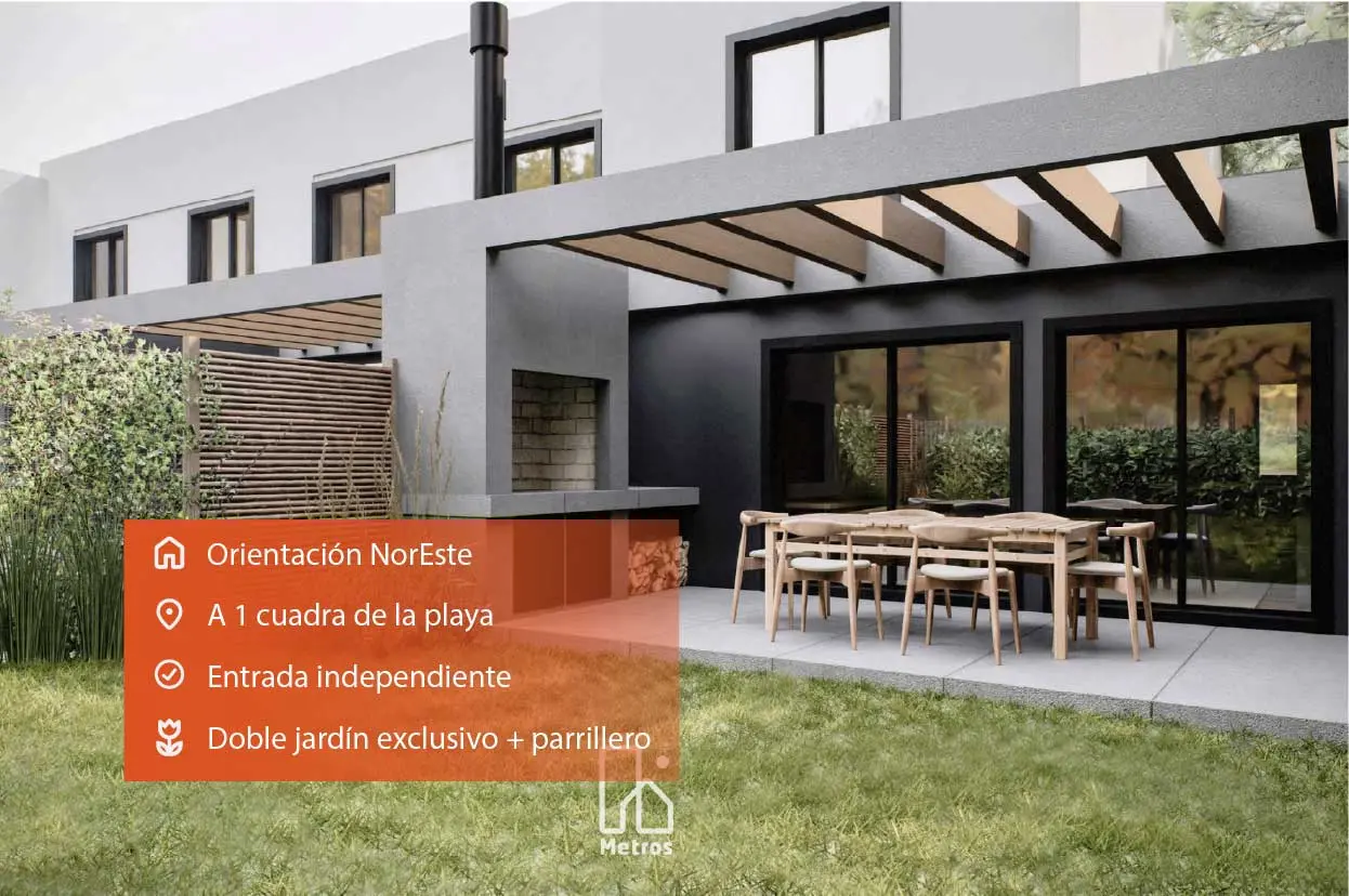 Construcción TRADICIONAL • Doble Jardín: al frente y al fondo • Muy buena orientación NorEste • A 1 cuadra de la playa • Estufa + Parrillero • Ambientes amplios, mayor que el promedio de housings en la zona • Entrada independiente a la calle, y mayor seguridad por tener casas alrededor • Altura de las plantas • posibilidad de personalización de algún ambiente