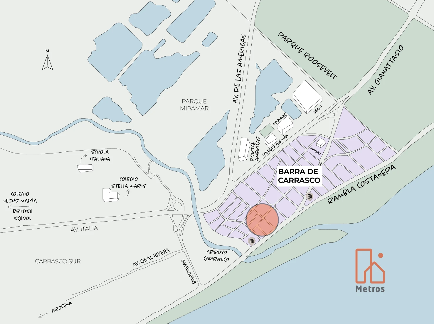 Ubicado en la mejor zona de Barra de Carrasco a tan solo 1 cuadra de la playa y a pocas cuadras del Puente Carrasco. Se destaca por ser un barrio residencial en constante crecimiento. El entorno verde y la tranquilidad de sus calles ofrecen un estilo de vida relajado y familiar.