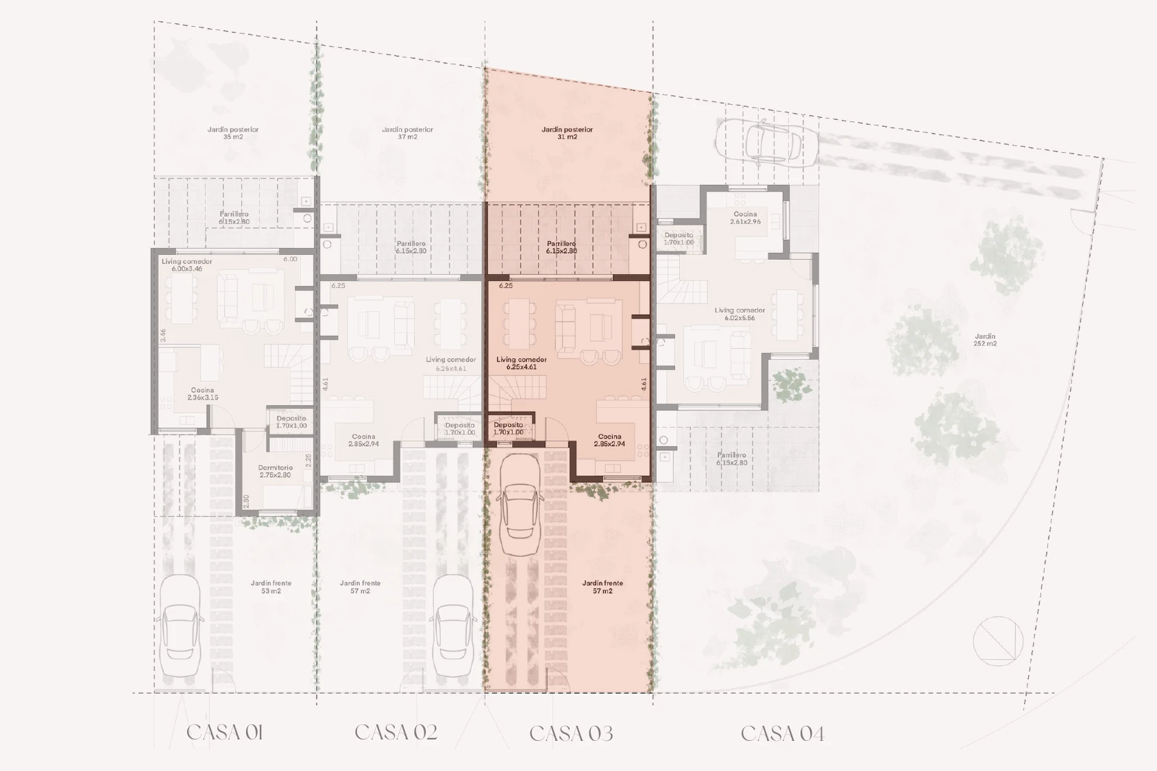 El proyecto está compuesto por 4 viviendas de 3 dormitorios, con entradas independientes con reja, portón vehicular y peatonal. Además, por el estado actual de la obra, brinda la oportunidad de personalizar terminaciones según las preferencias del comprador.