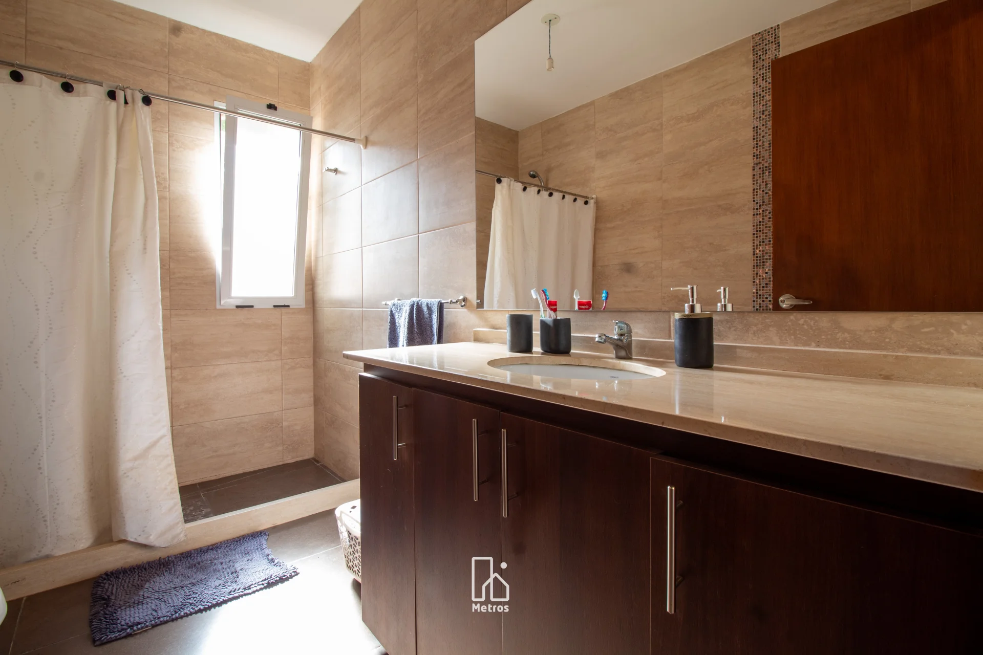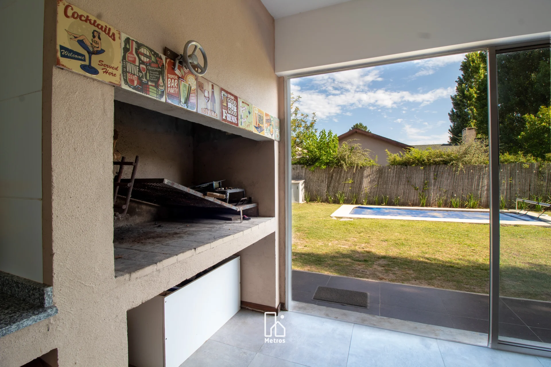Desde el living comedor se accede a una barbacoa cerrada con parrillero de 27 m², que puede integrarse completamente al interior para recibir cómodamente a familiares y amigos. Este espacio se conecta con un amplio jardín que cuenta con piscina climatizada mediante clorador de sal, lo que prácticamente elimina el mantenimiento. El jardín recibe todo el sol de la tarde, ideal para disfrutarlo al máximo.