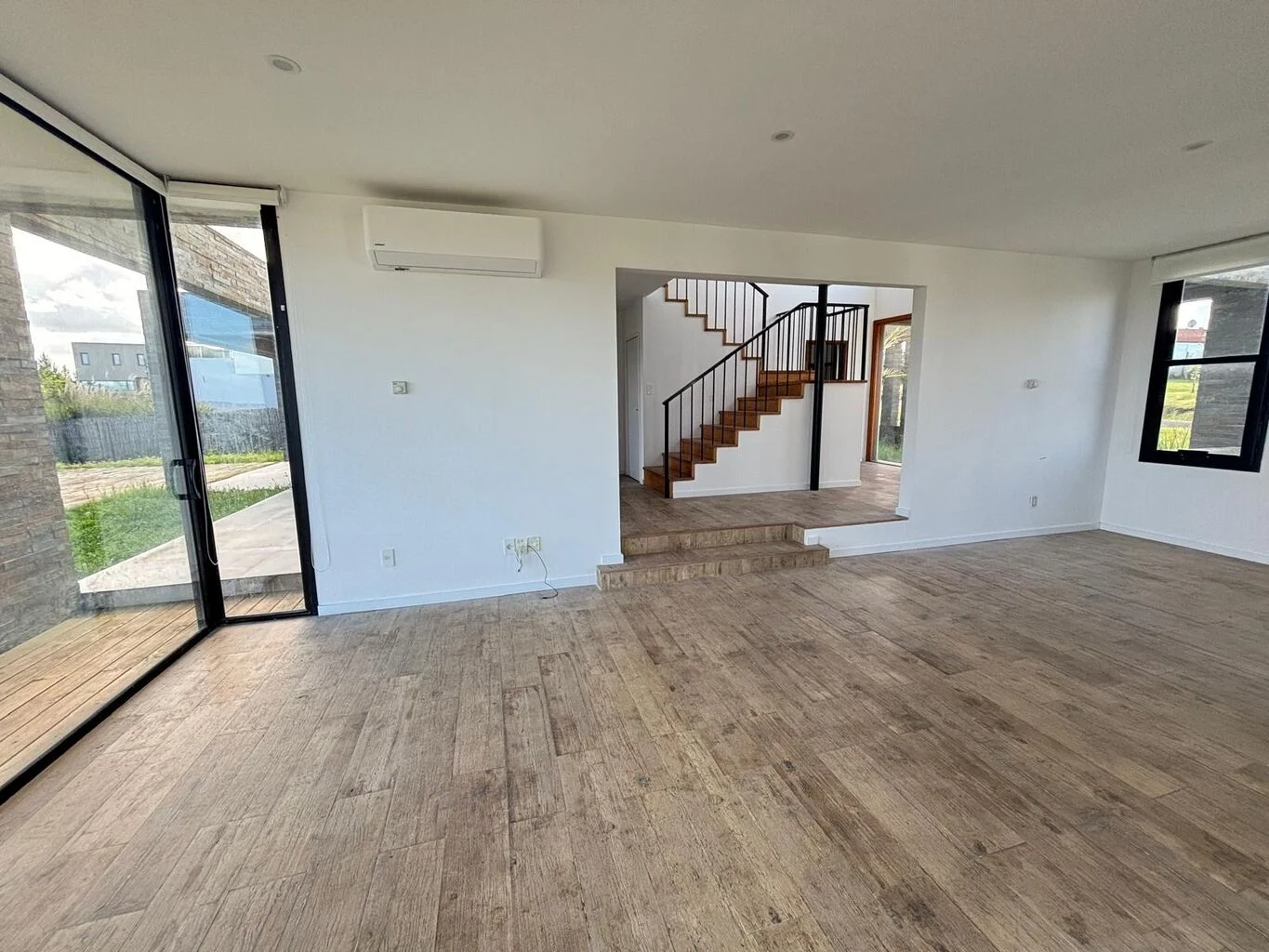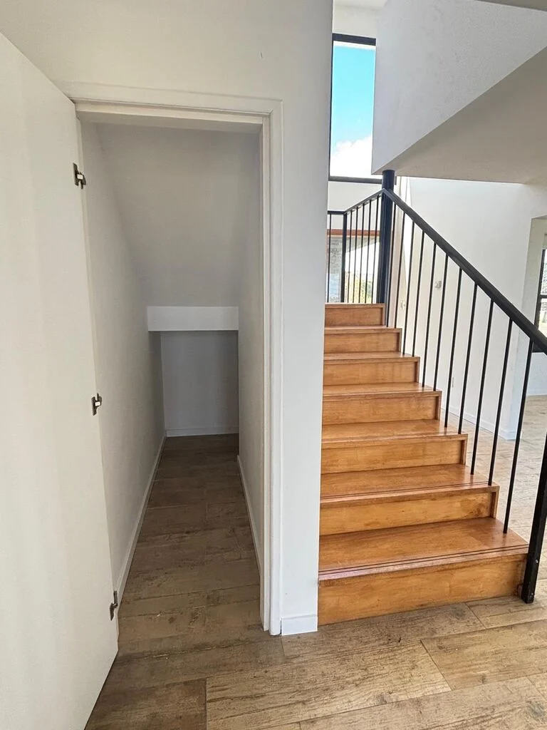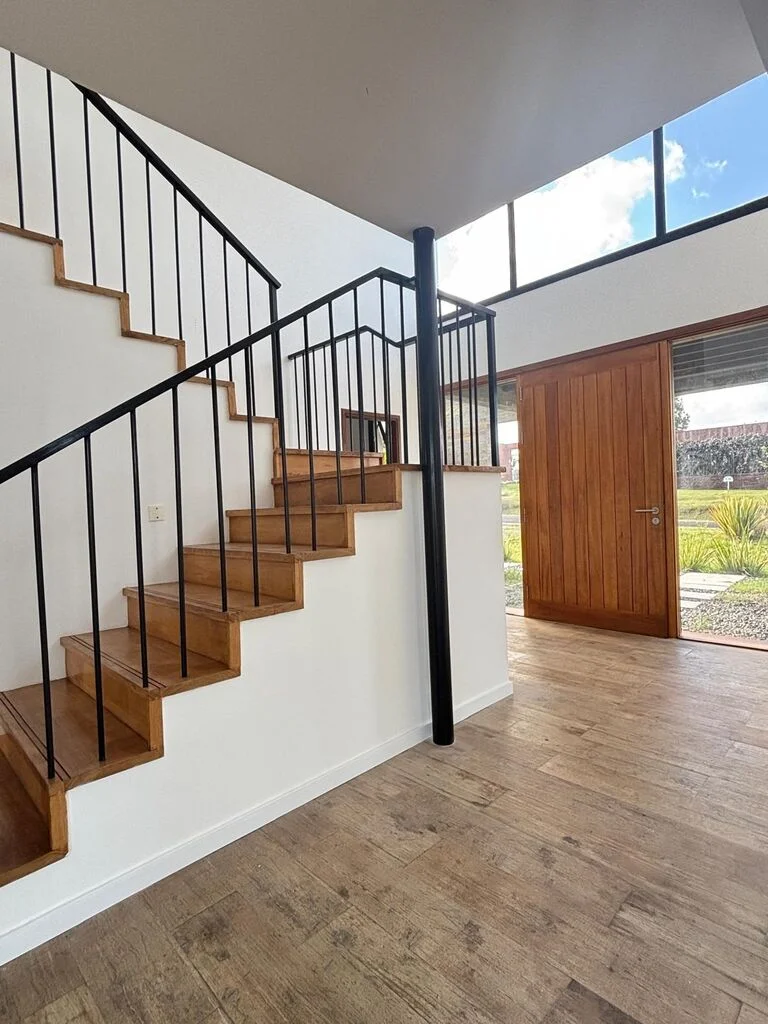Acceso principal con espacio de doble altura y escalera de madera.