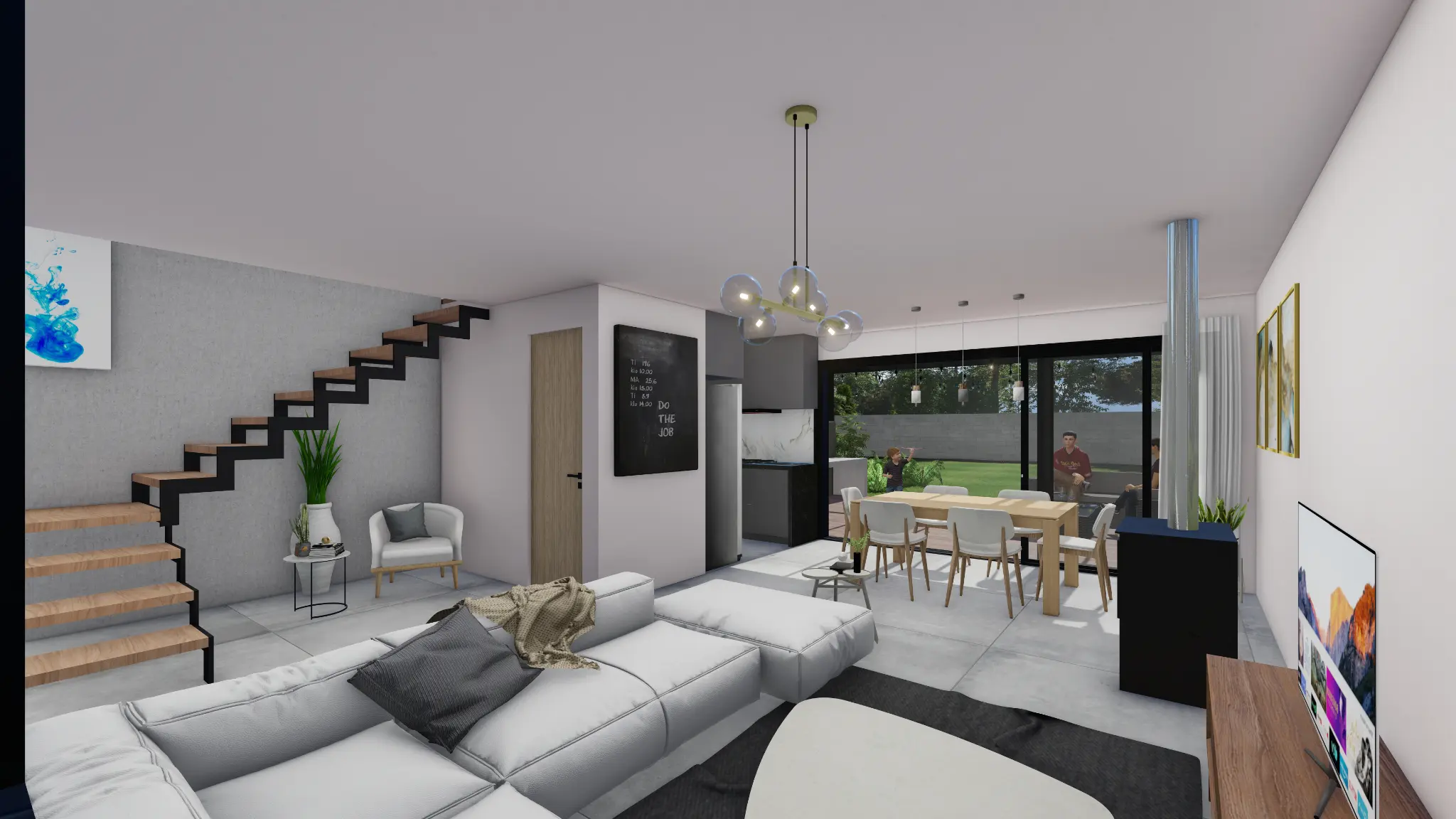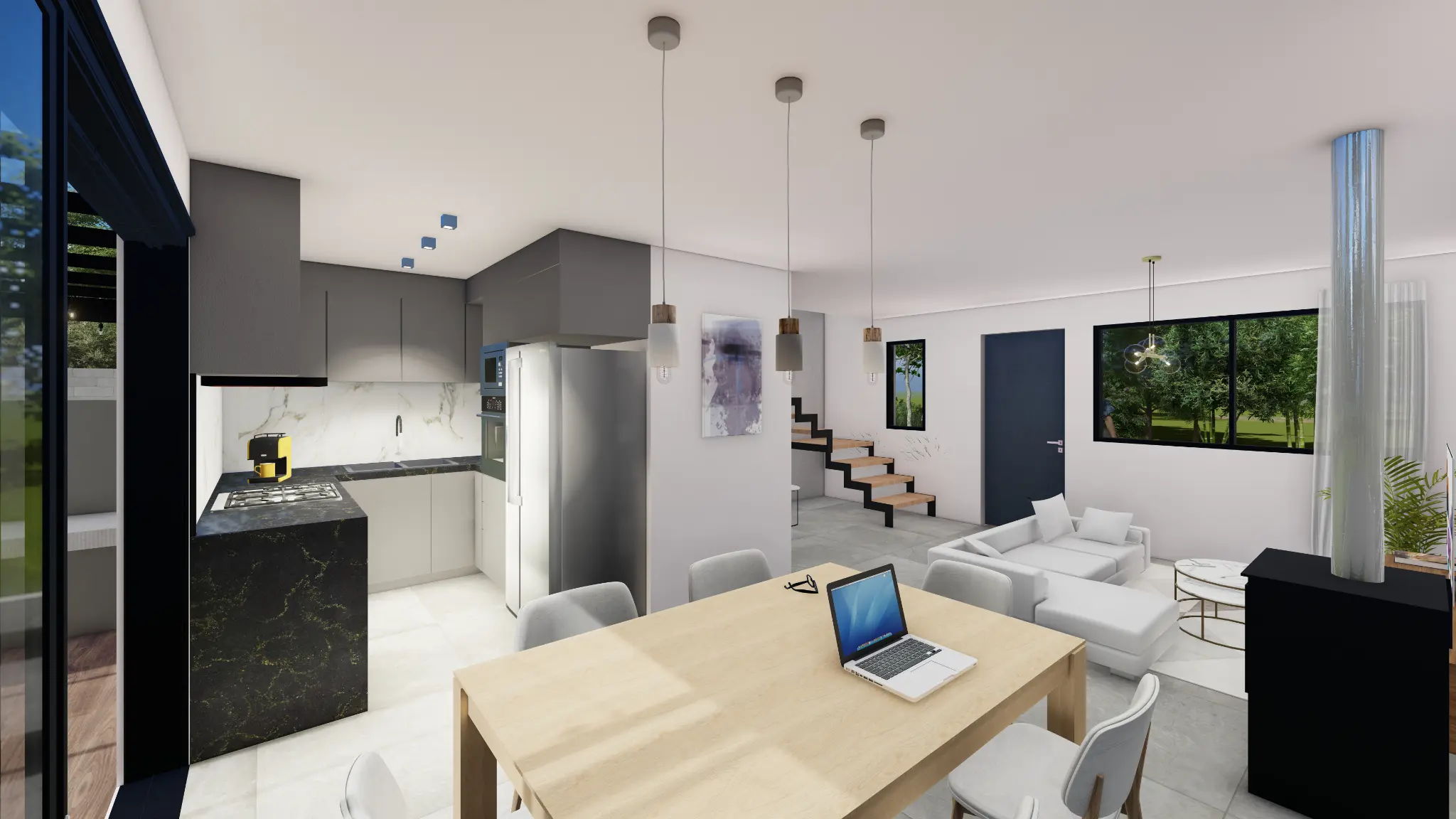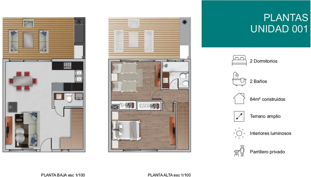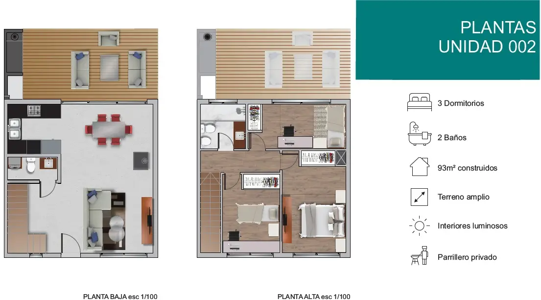 PLANTA BAJA: Living comedor con cocina integrada, la cocina cuenta con muebles aéreos y bajo mesada, baño social con previsión para lavarropas, estufa de alto rendimiento y previsión para conexión de aire acondicionado.