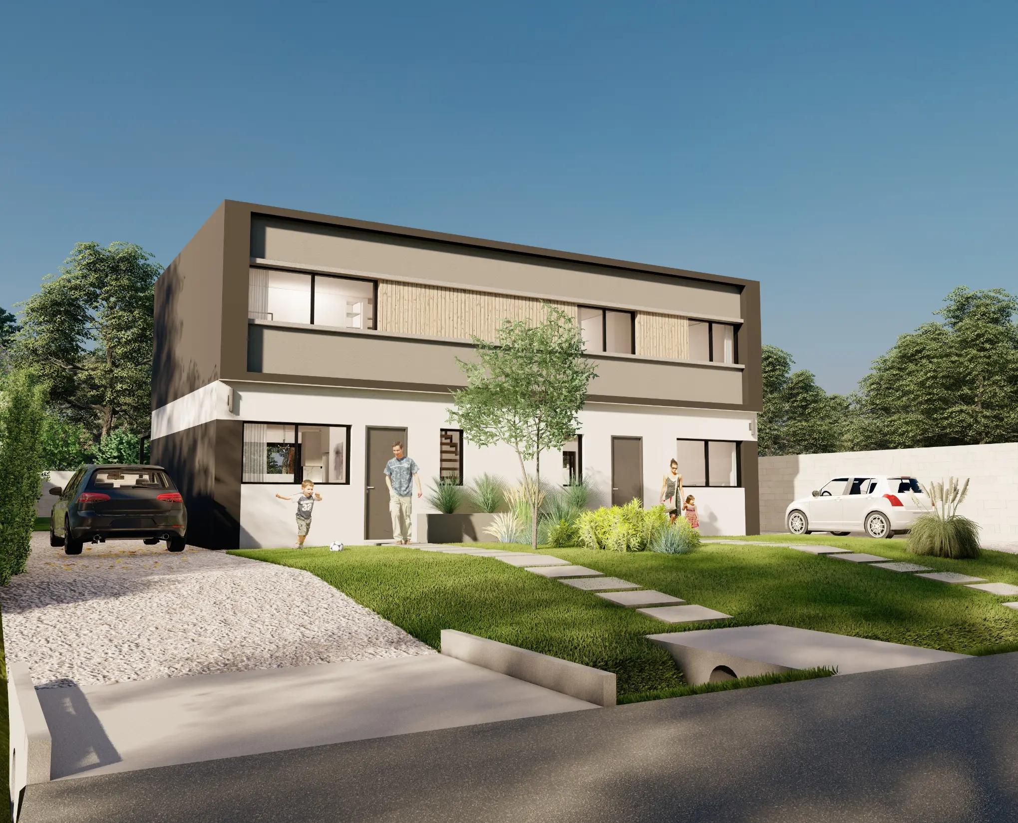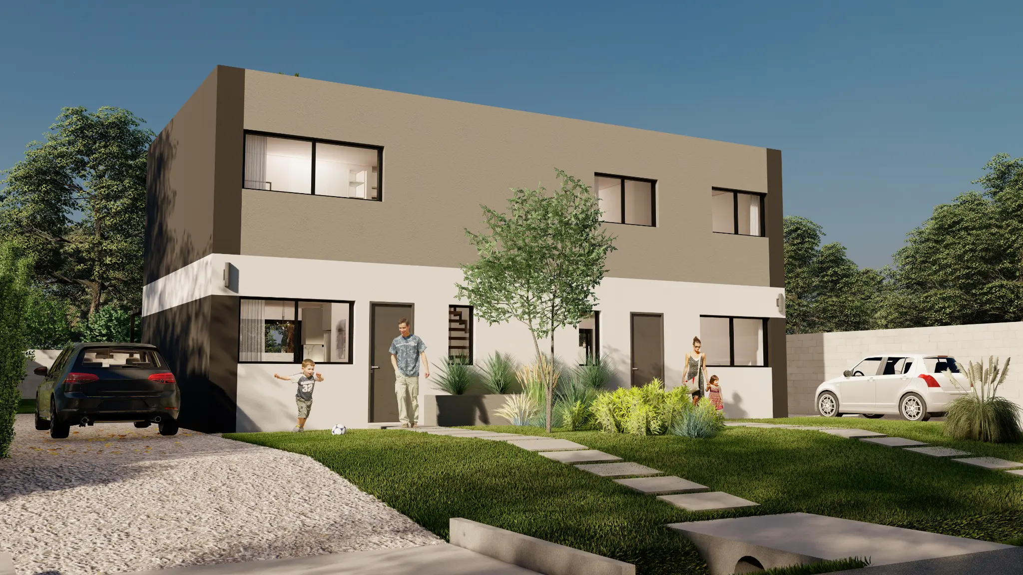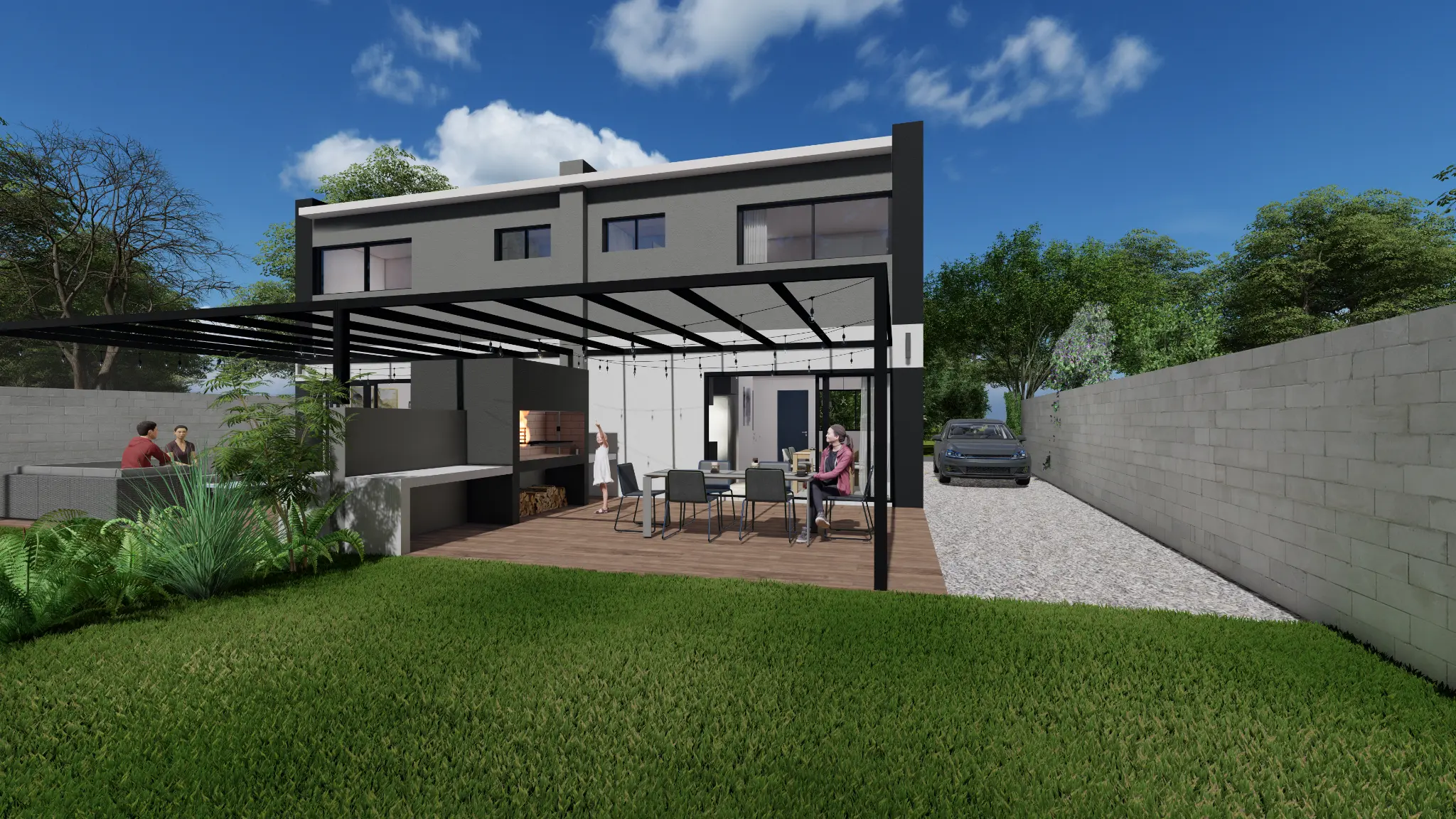 EXTERIOR: Lugar de estacionamiento vehicular con portón de entrada frontal, parrillero exterior con mesada, 230m2 de área verde libre.