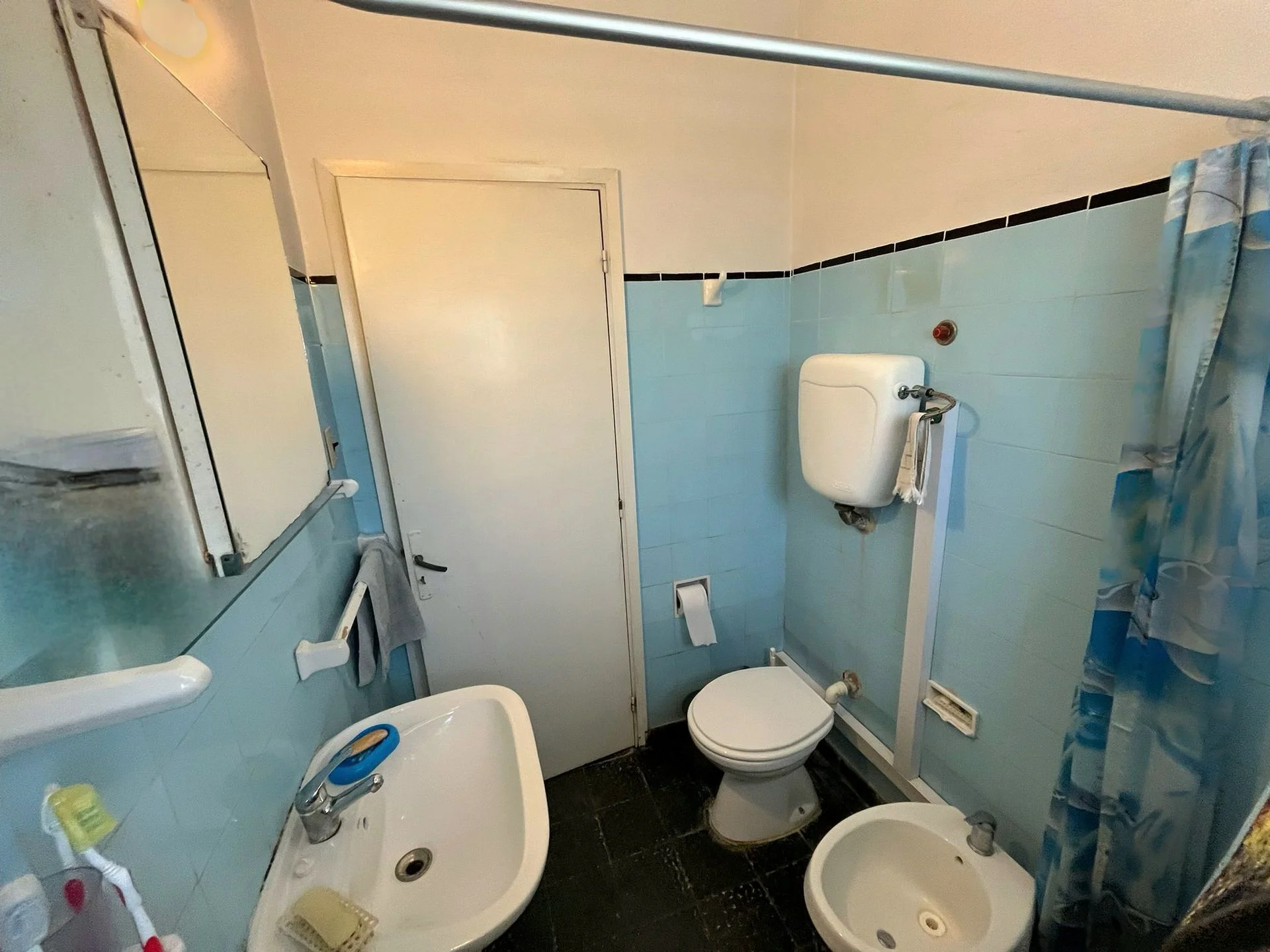 El baño completo para mejor comodidad en un corredor de distribución y cocina con placares bajo y sobre mesada con salida a patio trasero y conduce al gran fondo con mucho verde.