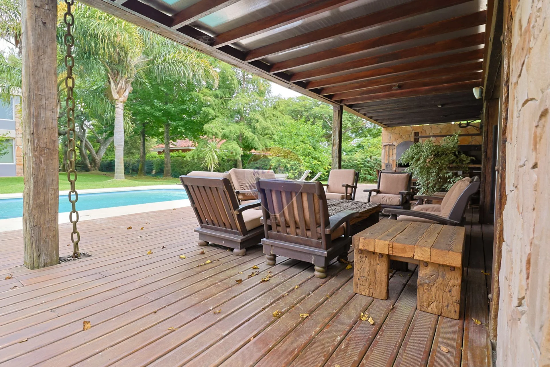 Parrillero amplio en piedra con horno de pizza sobre un gran deck de 100 m2 que nos comunica con la barbacoa o casa de huéspedes.