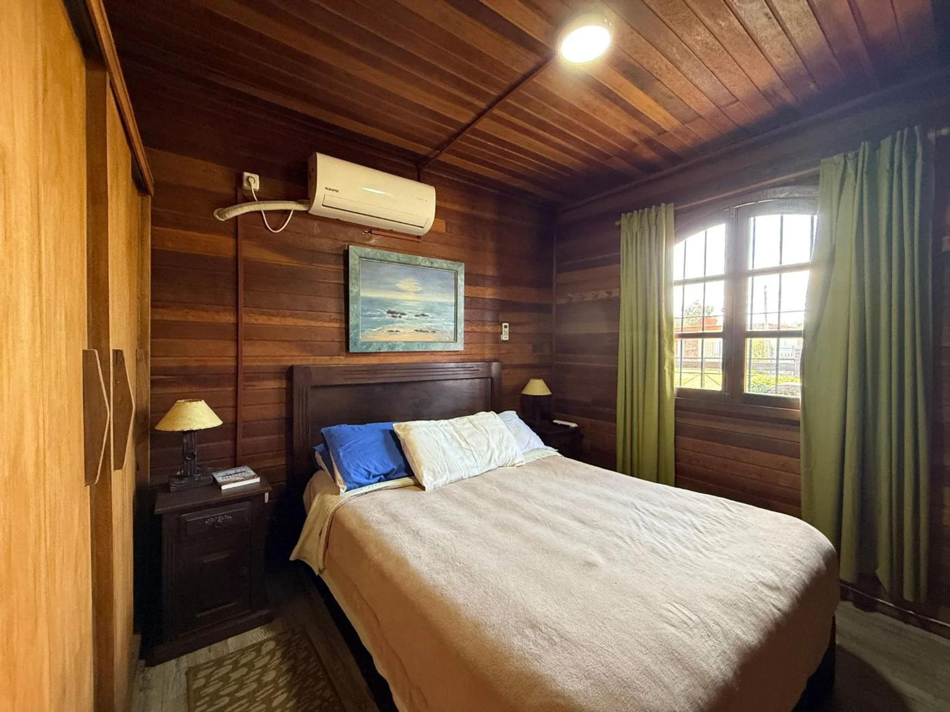 Al ingresar, un ambiente integrado de cocina, comedor y living acoge con amplitud y calidez. Varias ventanas y una puerta ventana hacia el frente aportan luminosidad y una sensación de amplitud a este espacio, que cuenta además con aire acondicionado y estufa a leña.