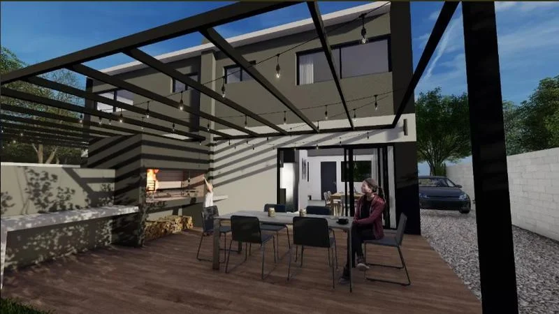 EXTERIOR: Lugar de estacionamiento vehicular con portón de entrada frontal, parrillero exterior con mesada, 230m2 de área verde libre.