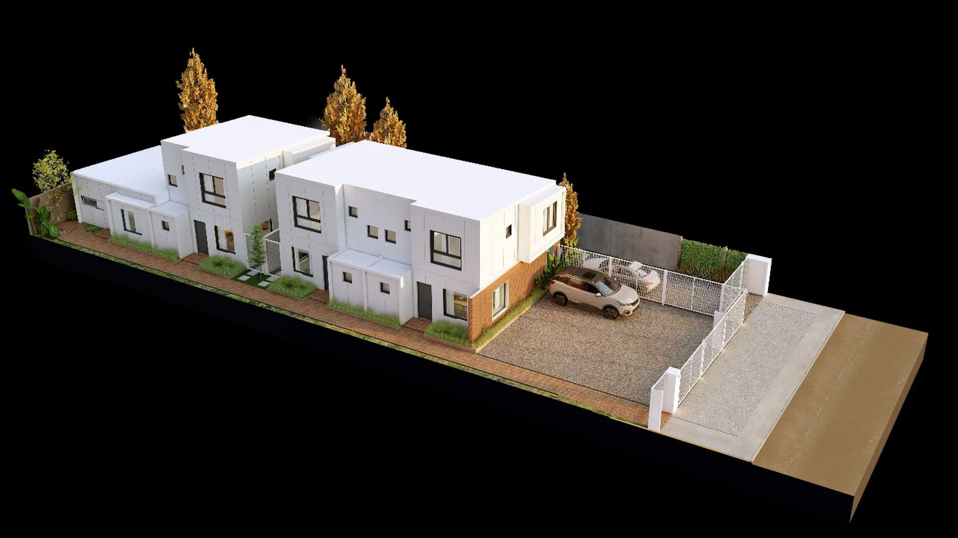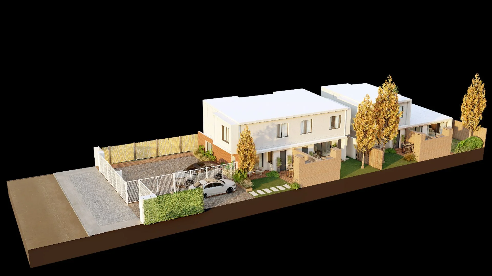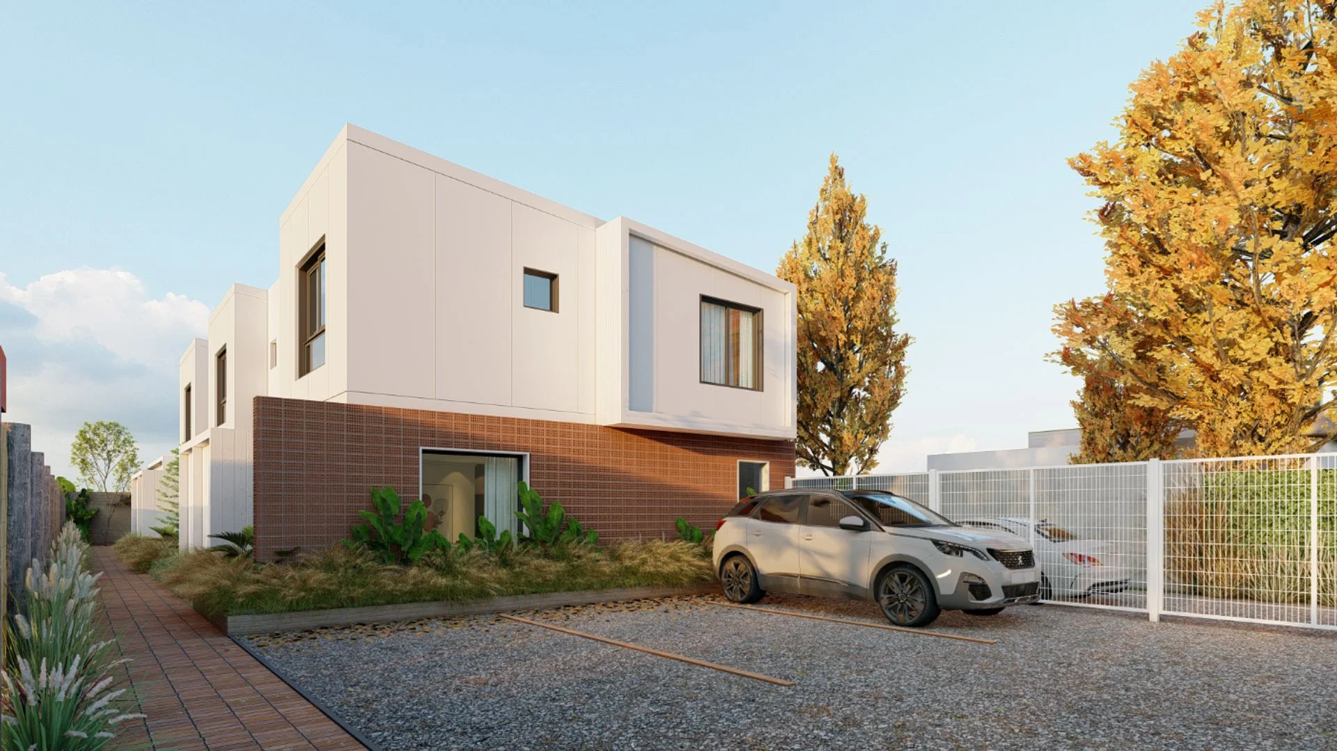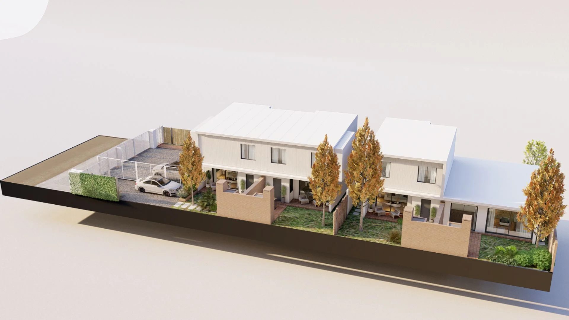 A través de un pequeño alero cubierto se accede a un área privada de jardín con parrillero y cochera de acceso propio, de 67 m2.