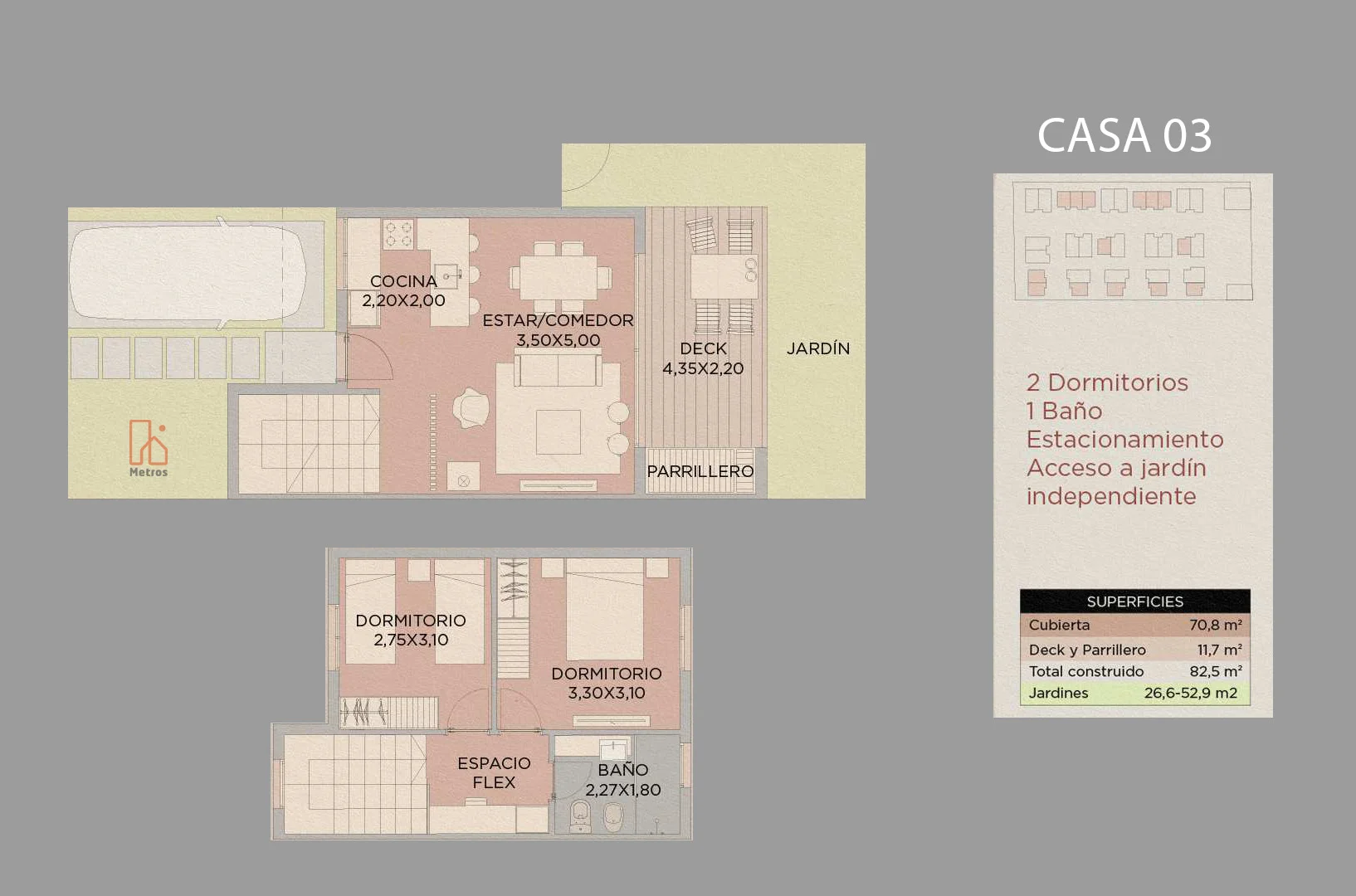 Jardín privado • 2 dormitorios • 2 baños • Deck con Parrillero • Cocina integrada • Living/comedor • Cochera