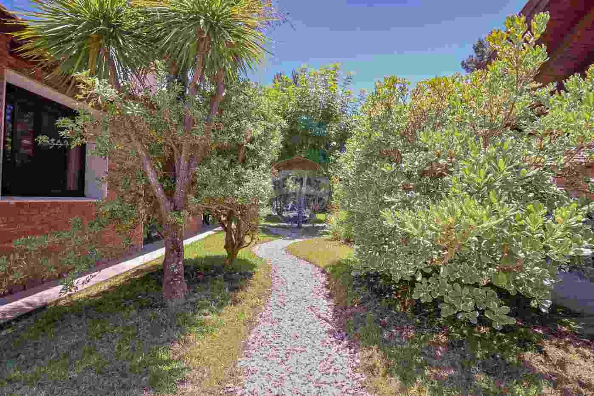 El complejo cuenta con espacio enjardinado de uso común y área de estacionamiento techado en la entrada al predio.