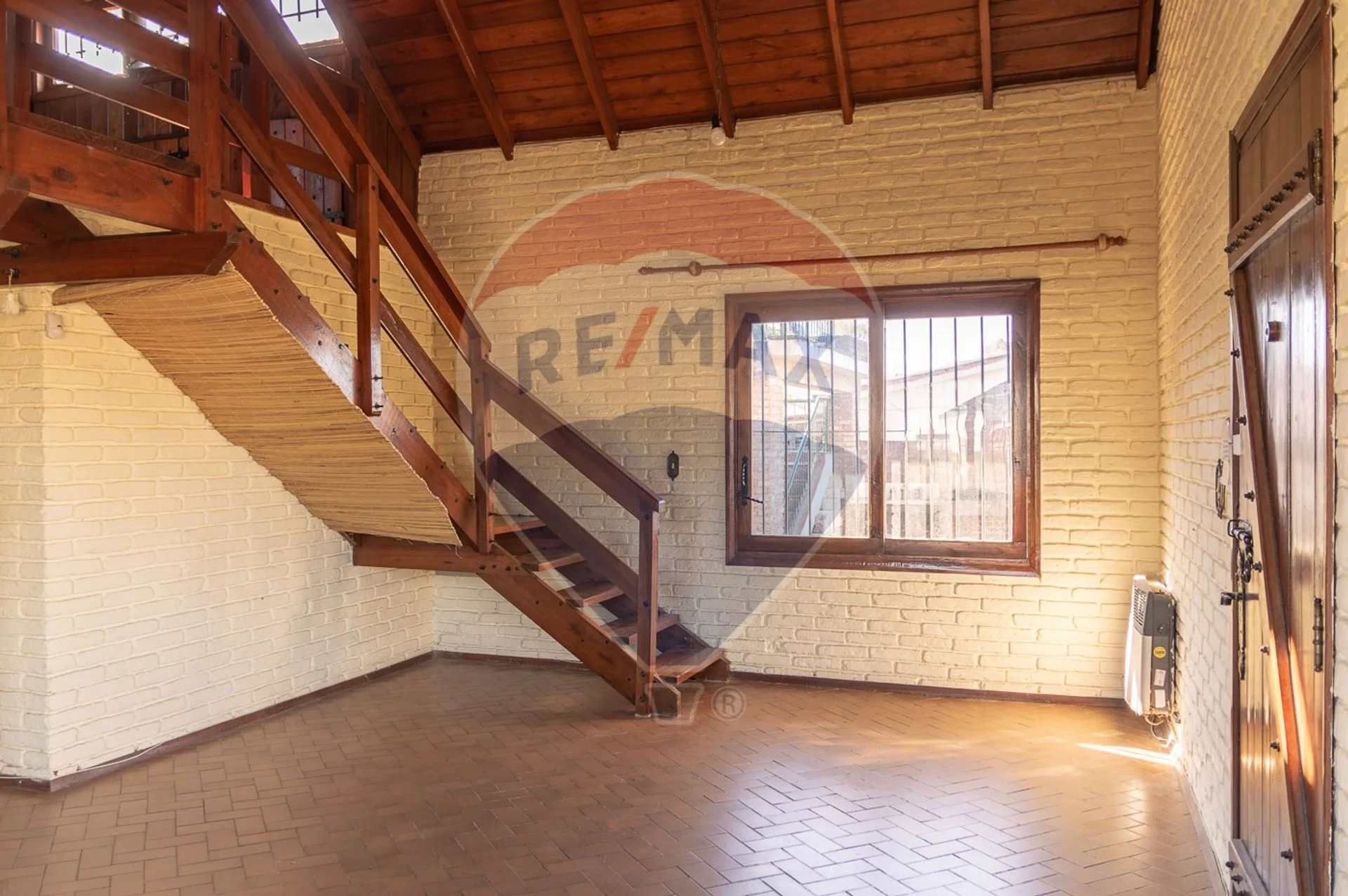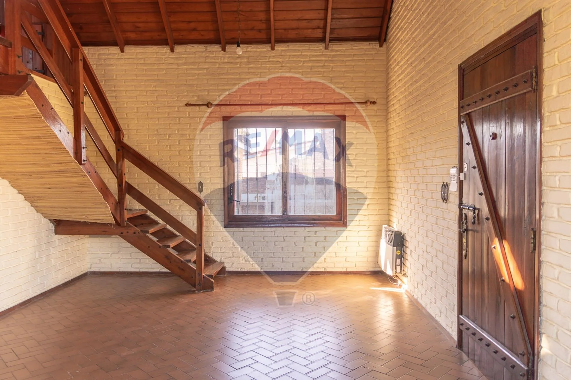 Un dormitorio con generosos armarios, baño completo, y un espacio adicional que puede funcionar como medio dormitorio o escritorio, parcialmente abierto hacia el living (balconea con baranda).