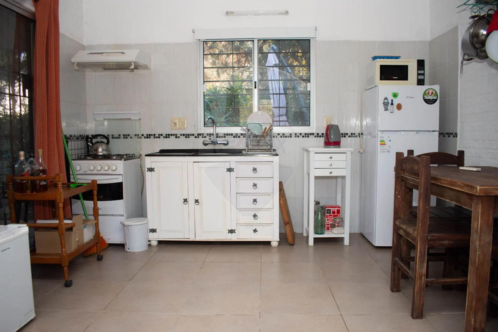 La cocina se encuentra delimitada por un arco, equipada con bacha de aluminio, mueble bajo mesada y ventana de aluminio con reja. Desde allí, se accede directamente al área del parrillero a través de una puerta-ventana con reja.