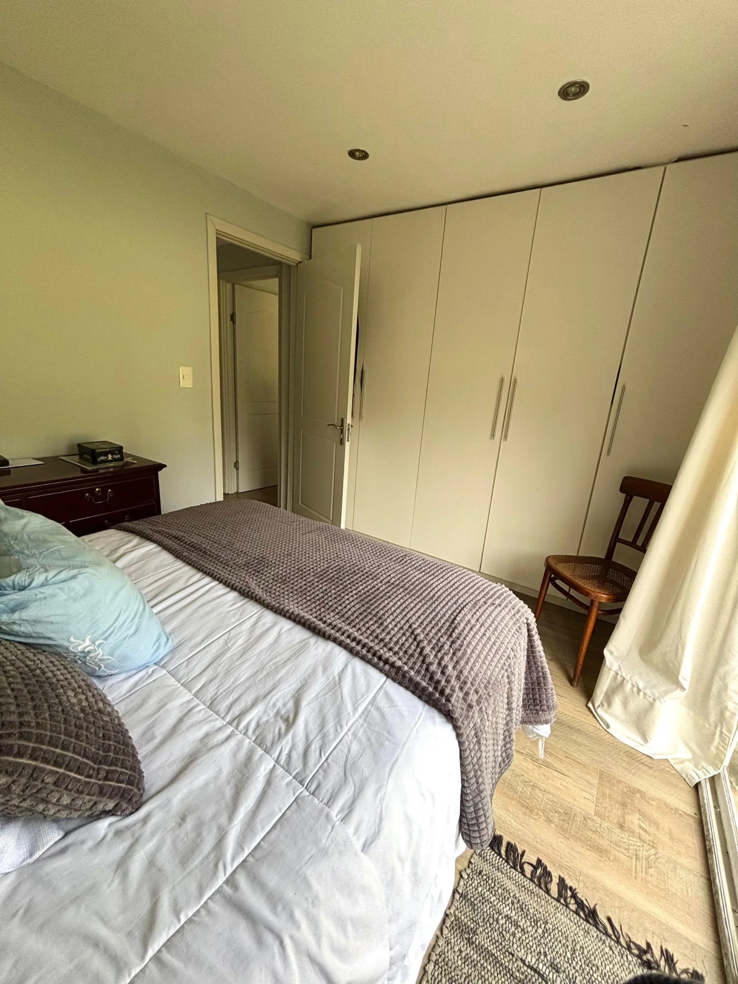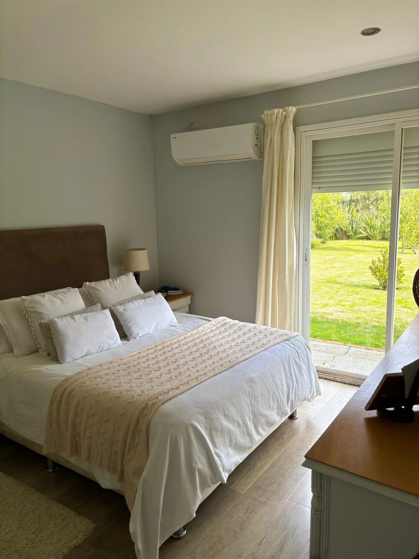 Dormitorio principal en suite con vestidor y vista al jardín.