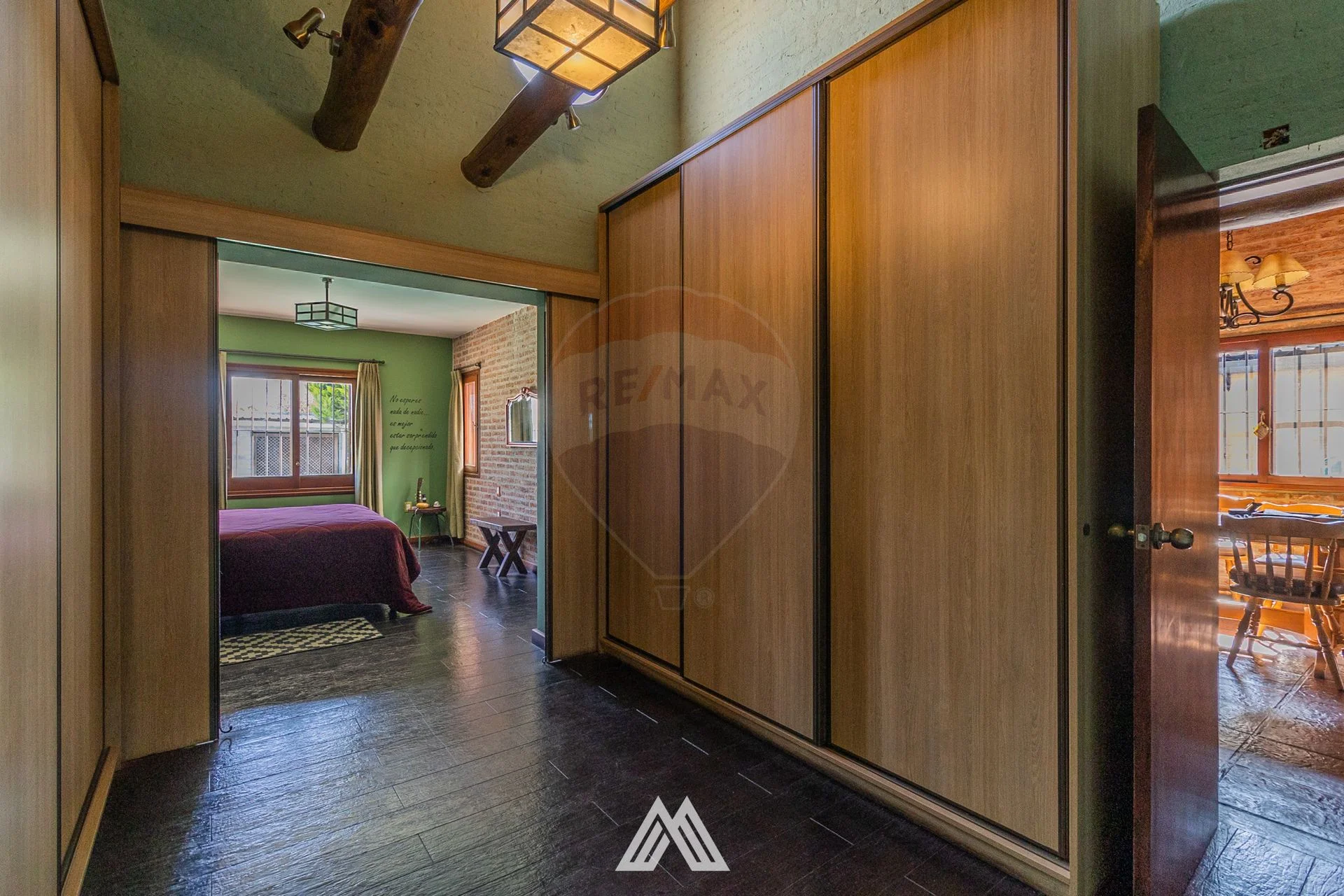 Casa principal posee living-comedor con estufa a leña, cocina con placares aéreos y bajo mesada, doble pileta, horno empotrado y anafe con campana extractora, puerta de madera con reja. Dos dormitorios, uno de ellos con doble ventana y baño completo. El dormitorio principal se destaca ya que cuenta con baño en suite y gran vestidor, brindando privacidad y confort, ventana al fondo con vista a la piscina.