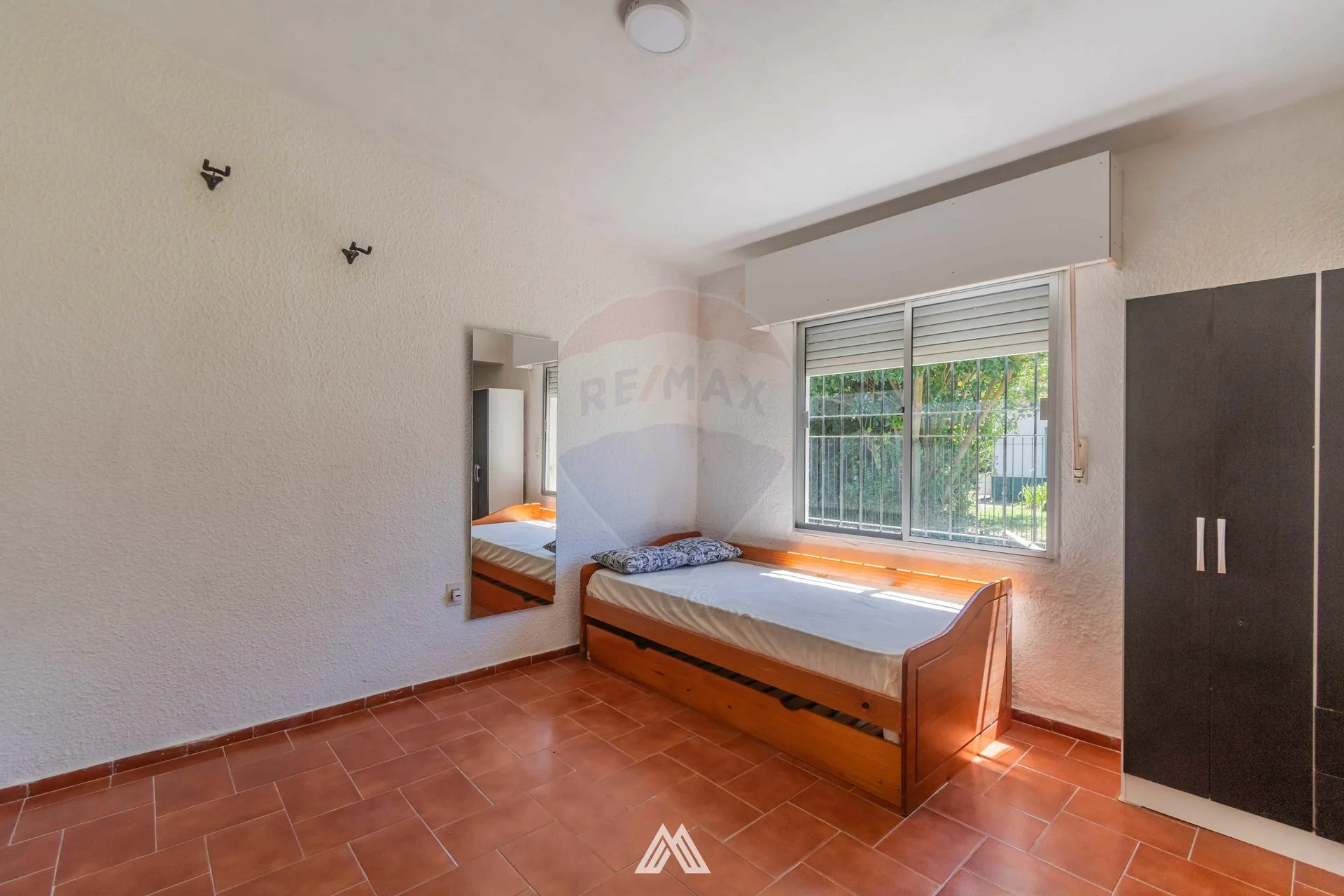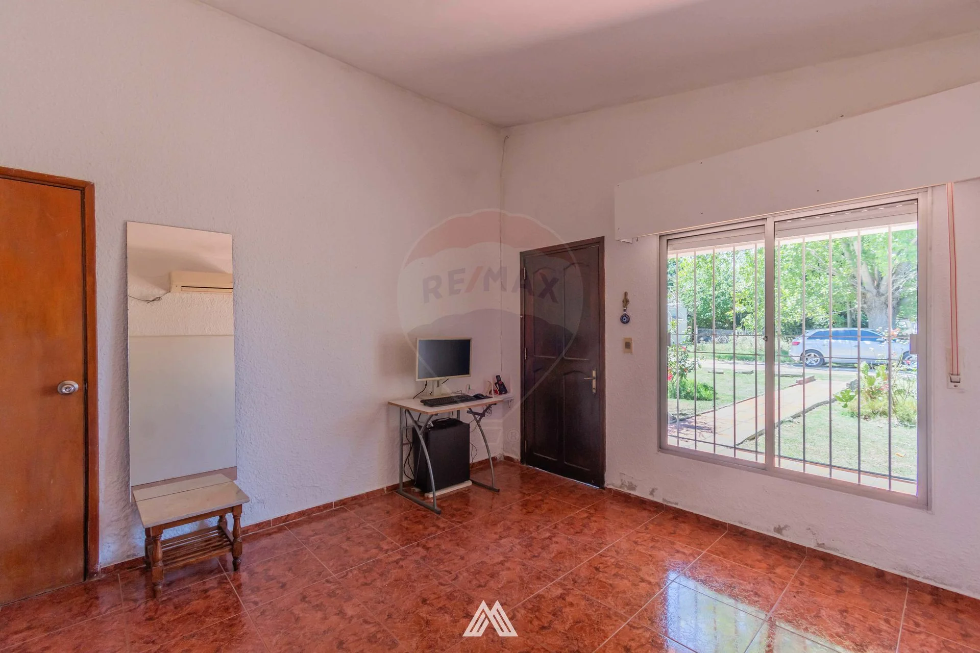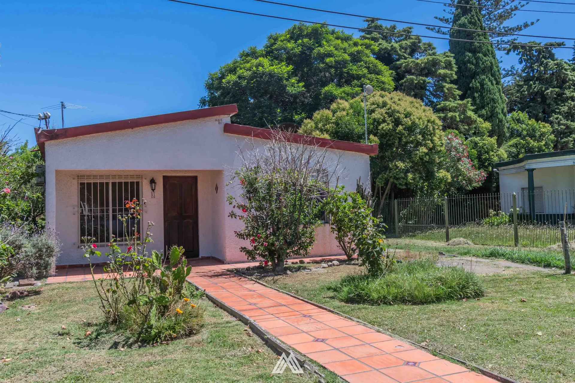 Al frente, un jardín con plantas y un caminero conducen a la entrada principal. El living es luminoso, con piso cerámico y una ventana al frente equipada con persianas y rejas. Un pasillo conecta los dos dormitorios, ambos con piso cerámico, ventanas con persianas y rejas. El baño es completo y revestido en cerámica.