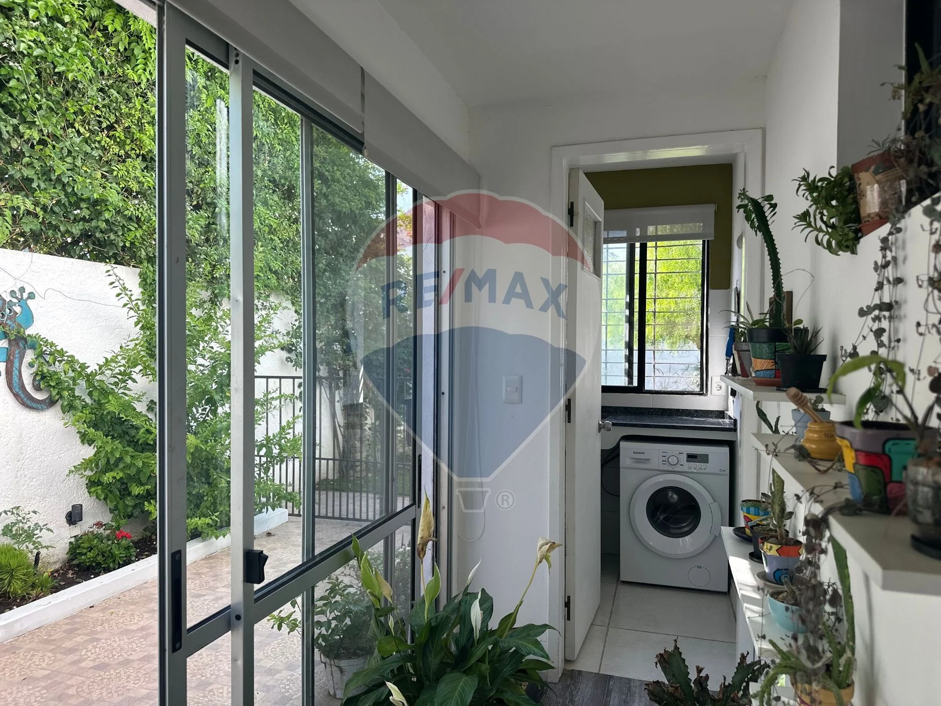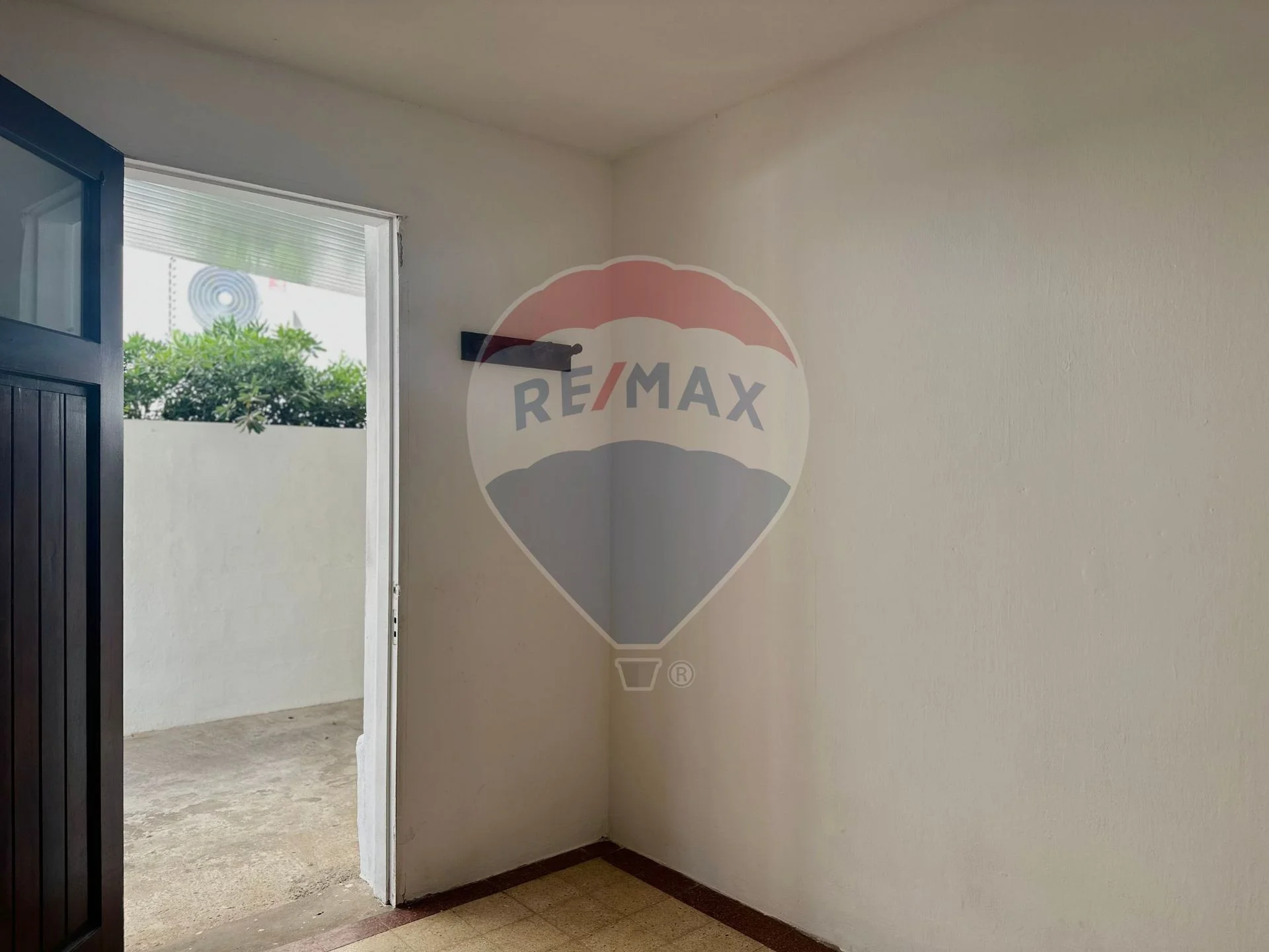 Pasillo de distribución, baño completo, espacio de servicio con acceso al garaje y dos dormitorios, uno con ropero empotrado, ambos con vistas al patio trasero.