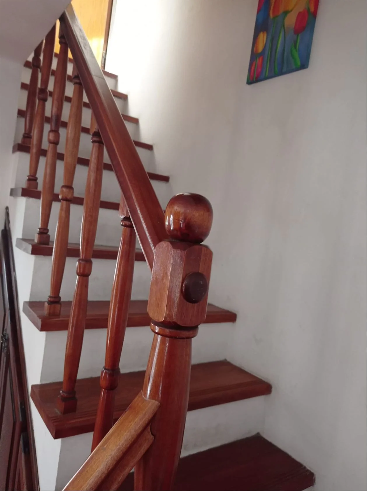 Aberturas en madera, persianas en madera, escalera en madera (cuenta con espacio cerrado para depósito) Rejas en aberturas principales y perimetral.