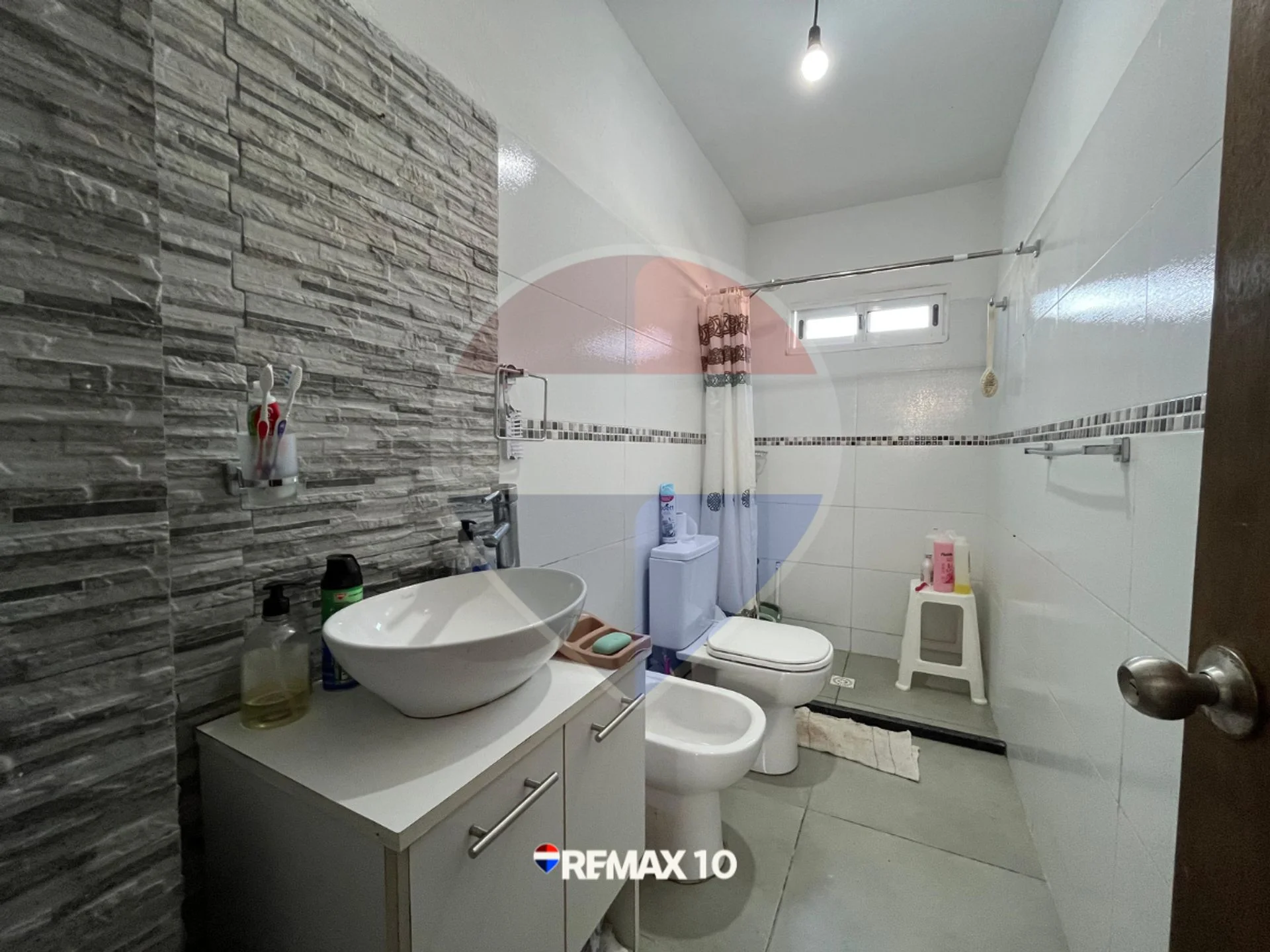 Baño completo: Baño de diseño contemporáneo, equipado con inodoro, bidet, mueble vanitory con bacha de apoyo y sector de ducha. Cuenta con revestimiento completo, destacando una elegante pared de acento con textura símil piedra.