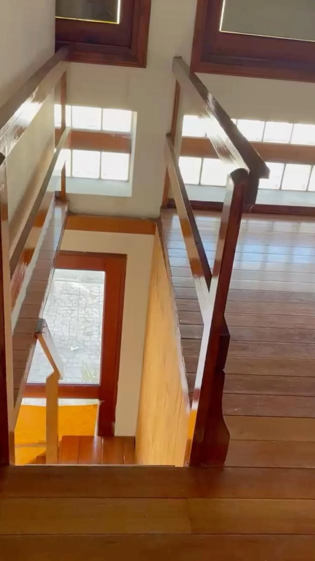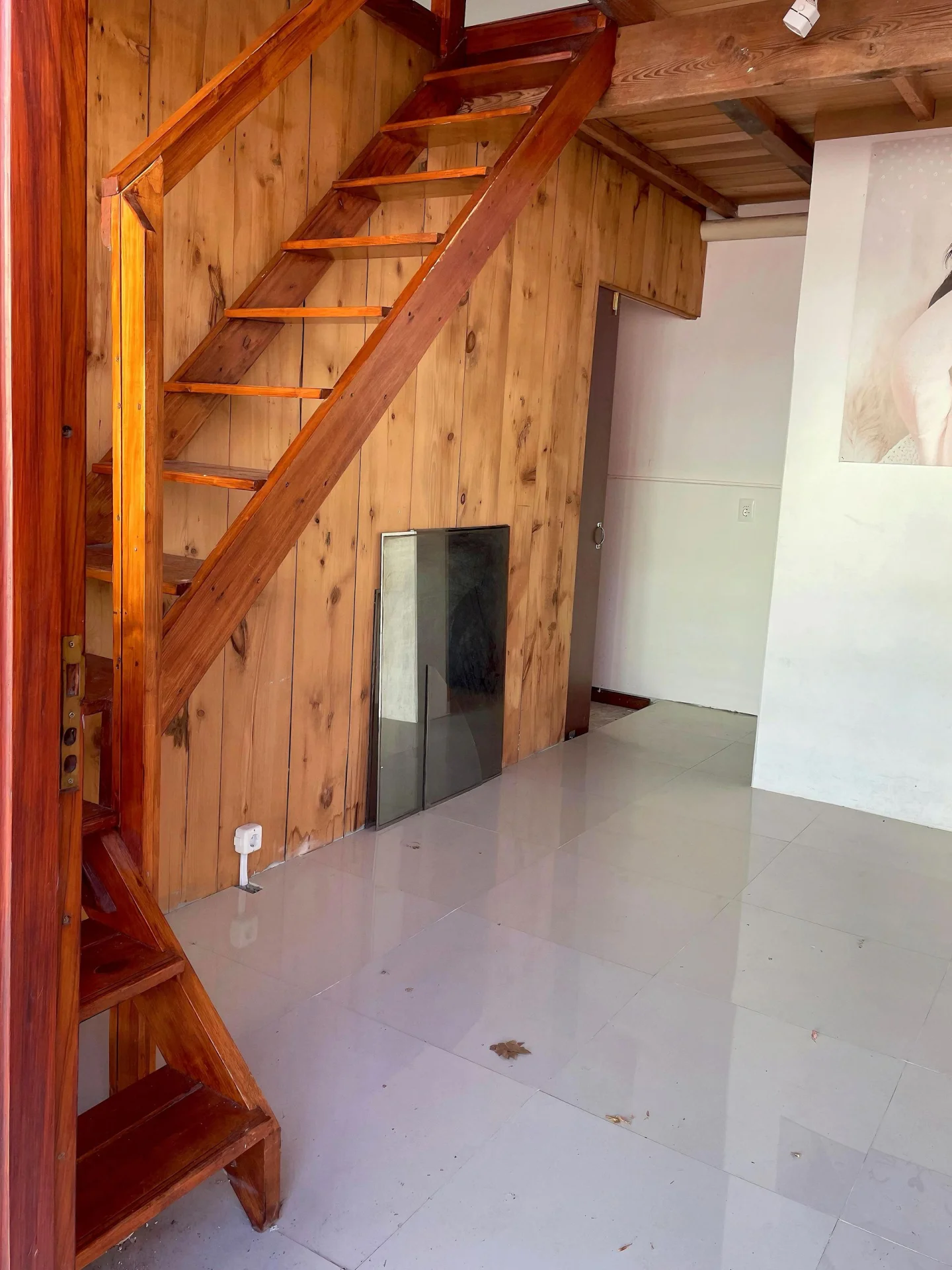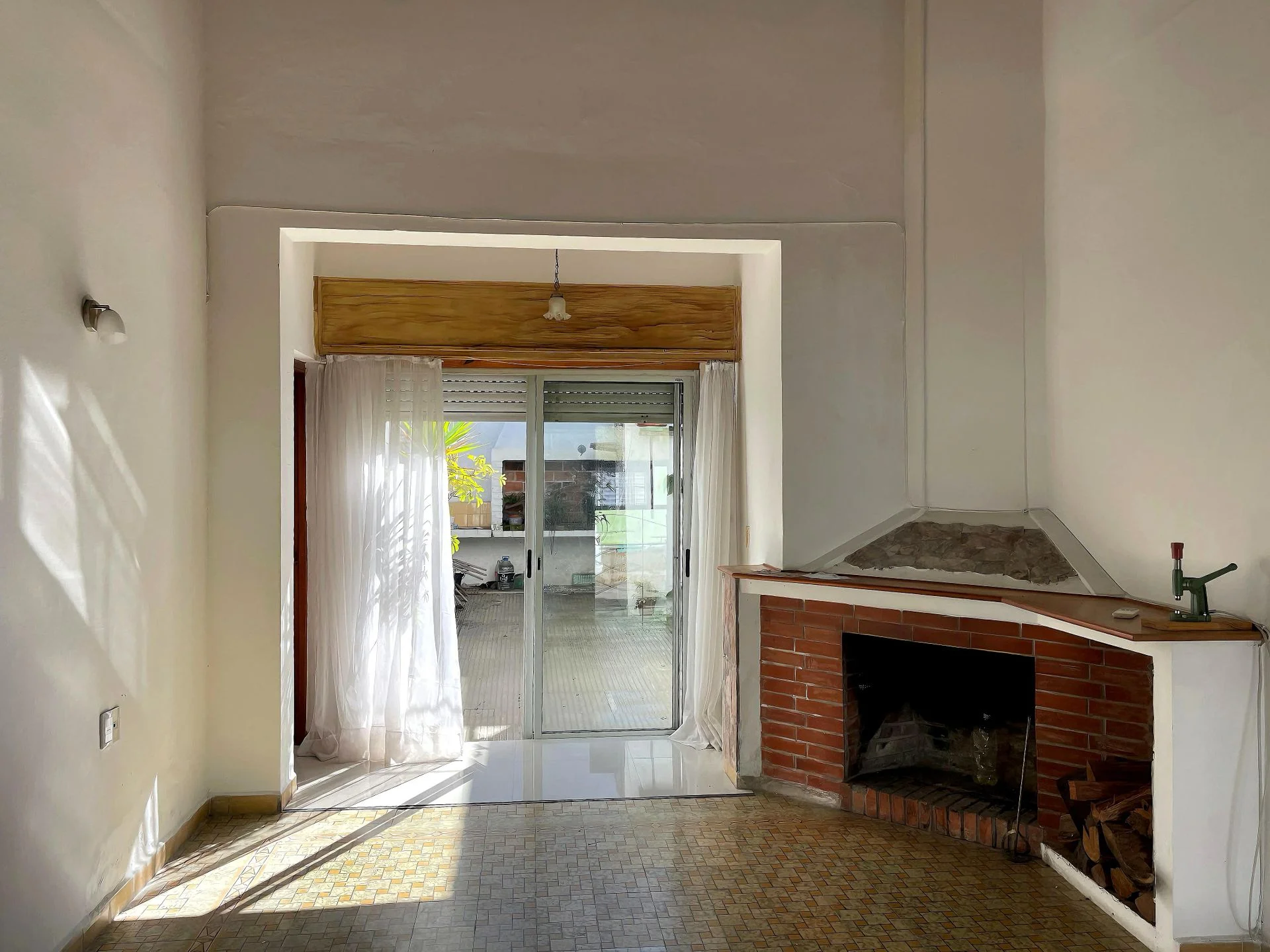 Al ingresar encontramos unas escaleras que llegan a un living con estufa a leña con puerta ventana con salida al patio.