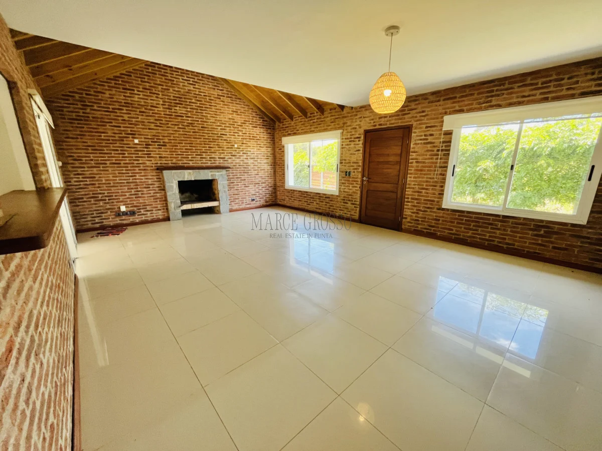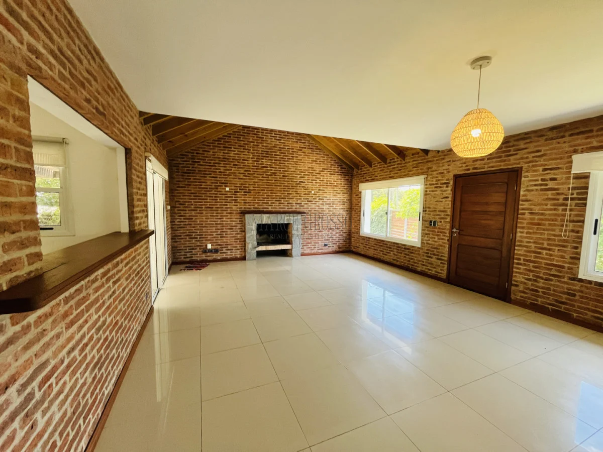 living comedor con estufa a leña, toilette, cocina semi integrada con salida a terraza con pérgola y parque con parrillero.