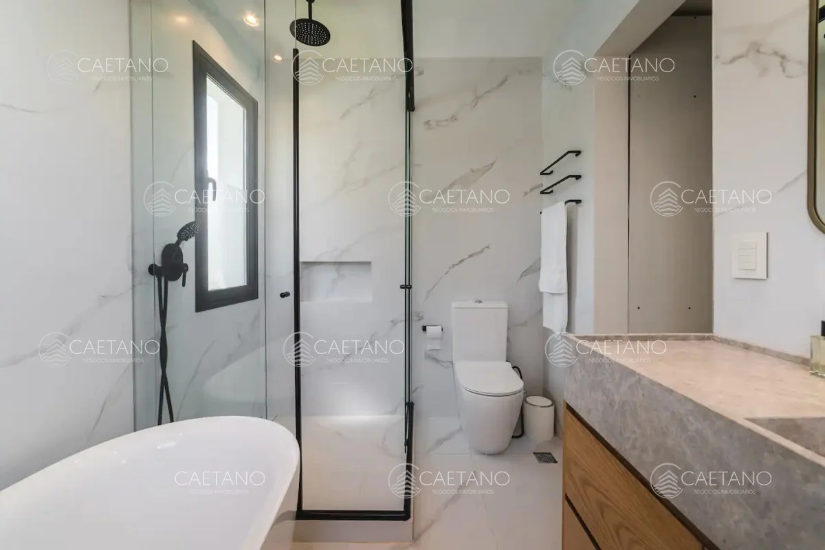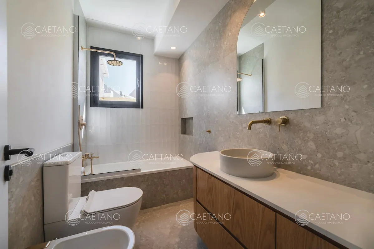 recibidor de buen tamaño, tres dormitorios principal en suite con vestidor, más un baño. Cochera techada y patio con piscina.