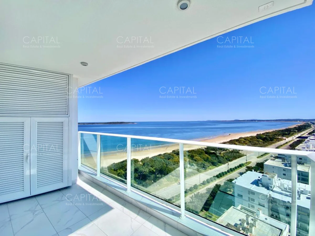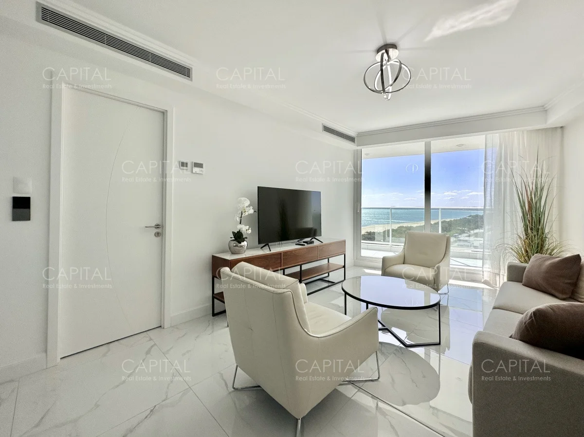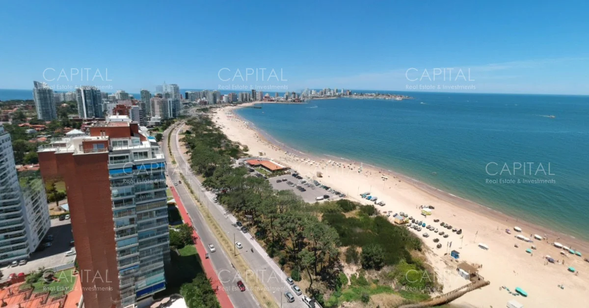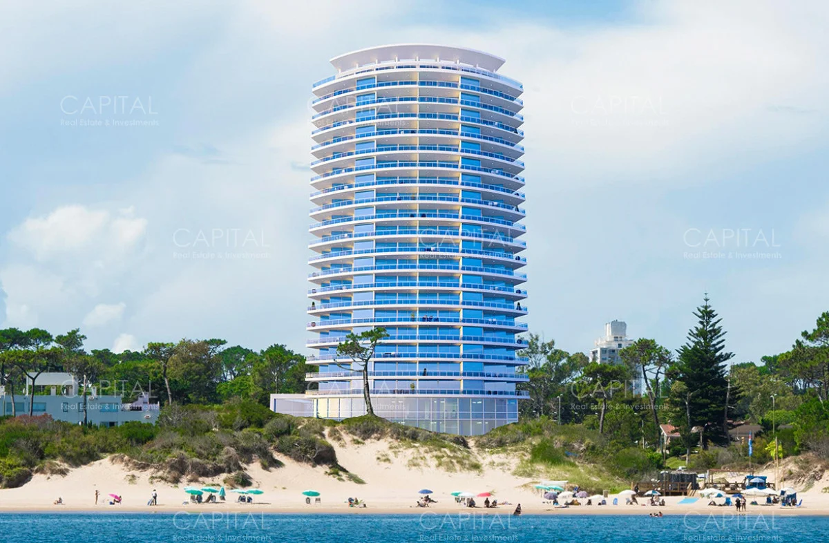 Apartamento de dos dormitorios uno en suite mas toilette social, palier privado con ocho ascensores de gran velocidad, la ubicación del edificio en primera linea frente al mar ofrece una vista totalmente panorámica de la Playa Mansa.