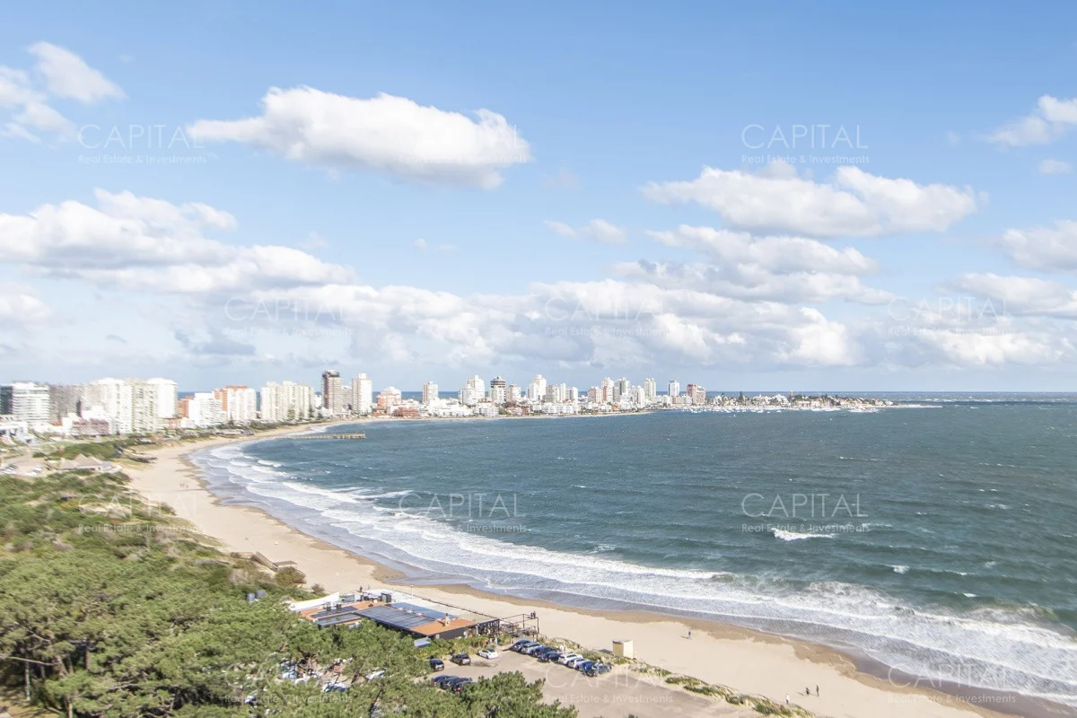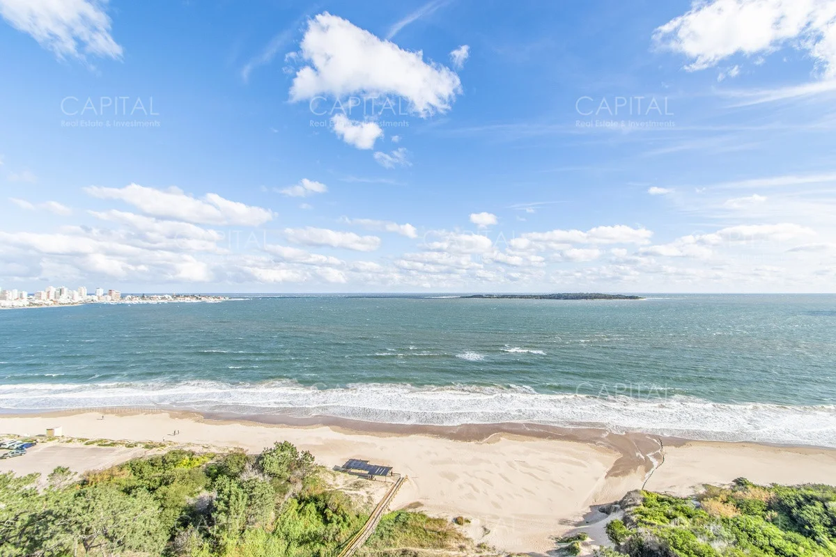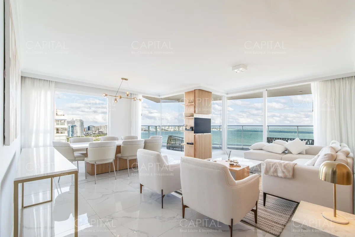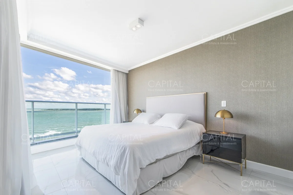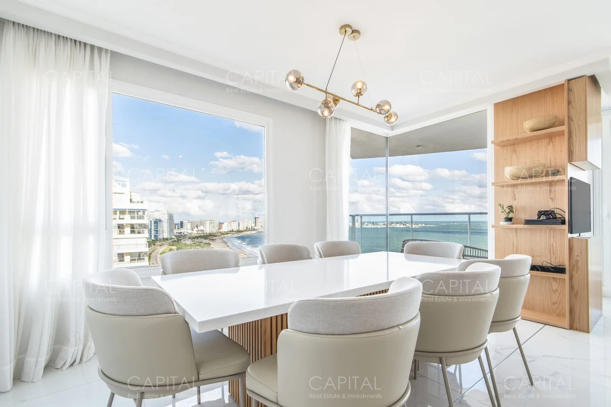 Apartamento de tres dormitorios en suite mas dependencia con baño y toilette social, palier privado con ocho ascensores de gran velocidad, la ubicación del edificio en primera linea frente al mar ofrece una vista totalmente panorámica de la Playa Mansa.