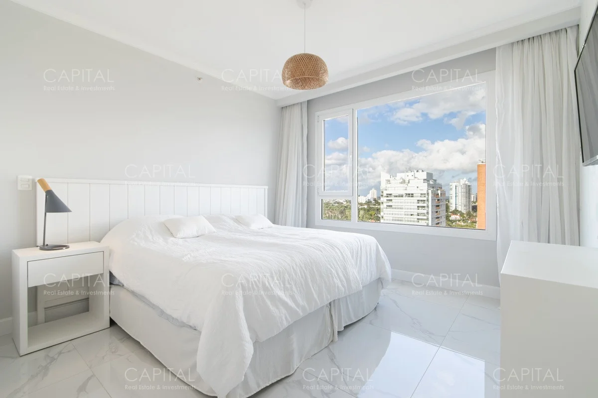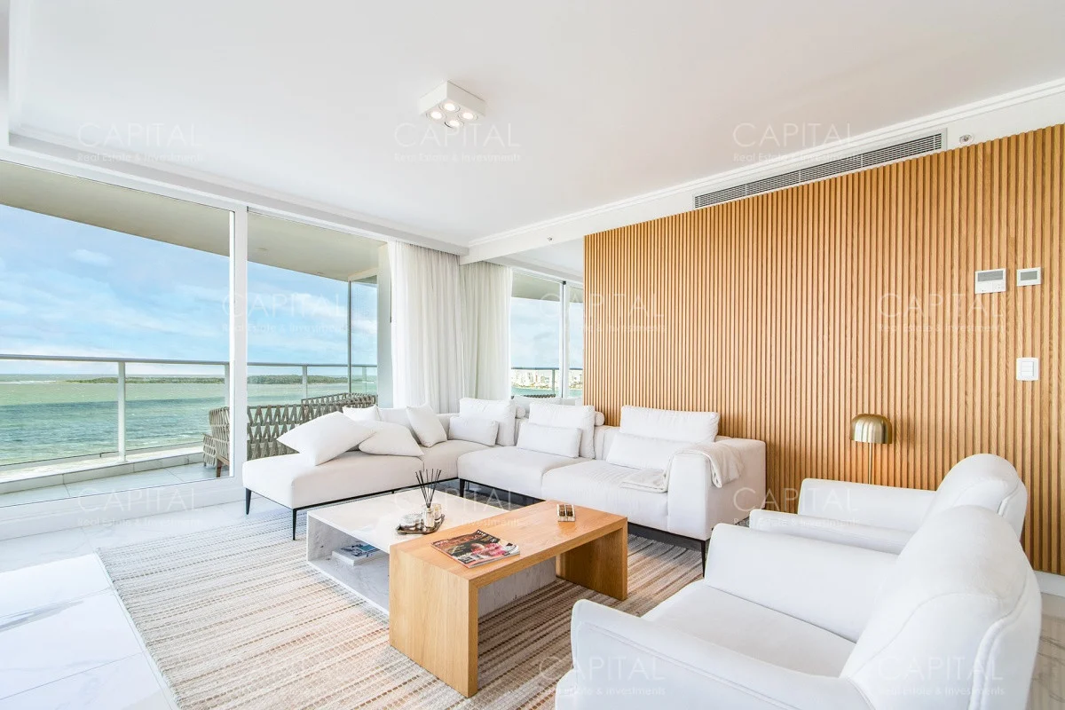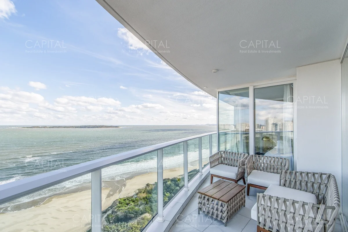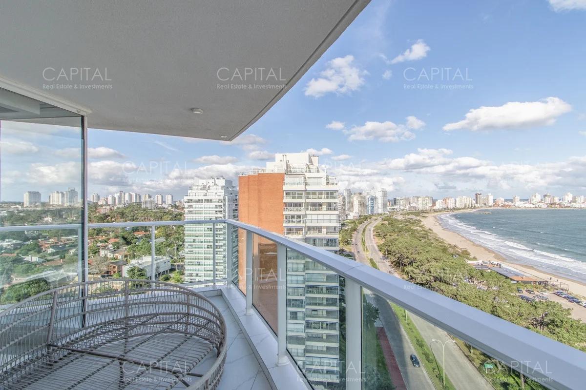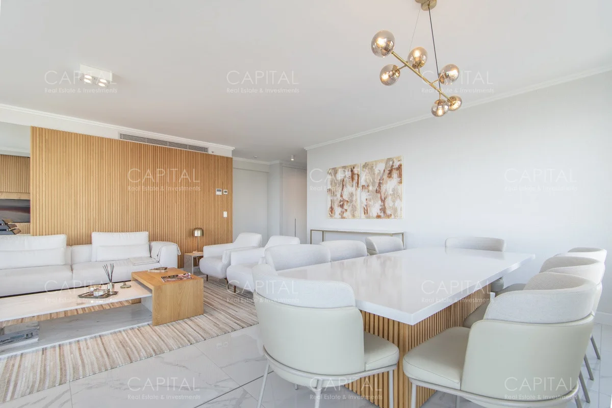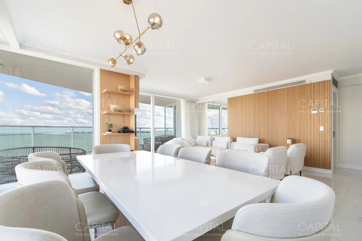 Apartamento de tres dormitorios en suite mas dependencia con baño y toilette social, palier privado con ocho ascensores de gran velocidad, la ubicación del edificio en primera linea frente al mar ofrece una vista totalmente panorámica de la Playa Mansa.
