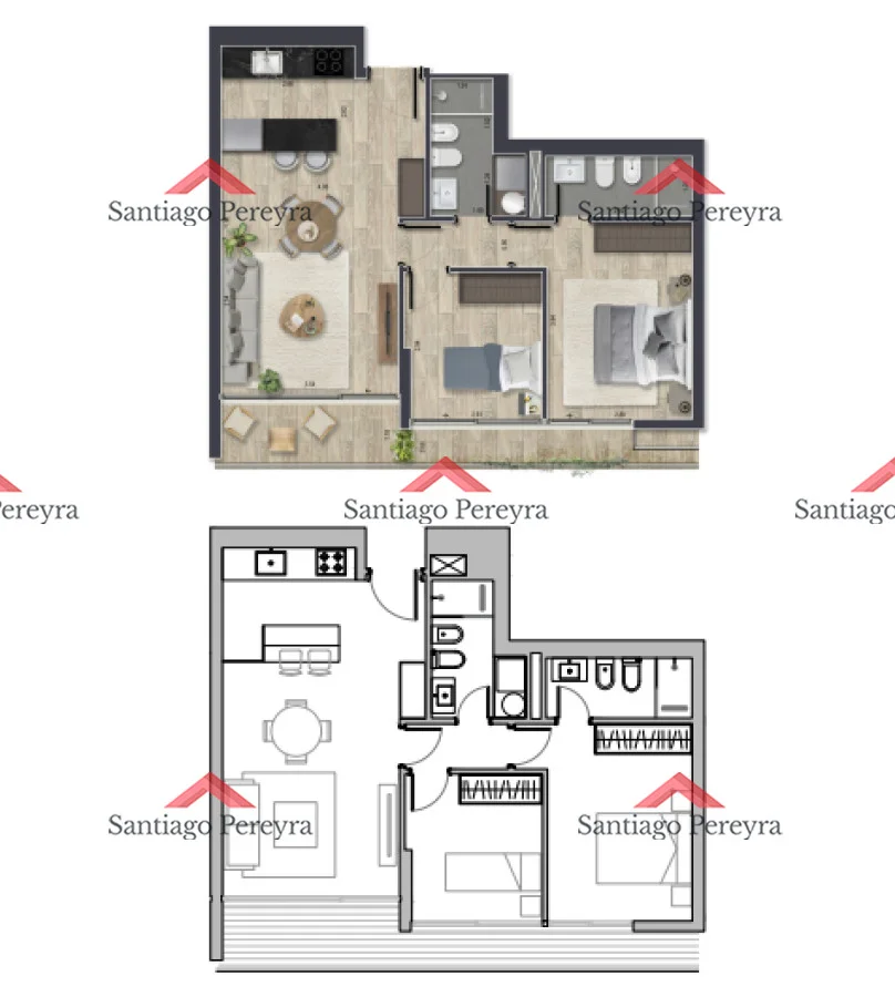 La planta se ubica en un piso medio. La misma, es frontal a la calle chiverta y se distribuye en 2 dormitorios (uno en suite), 2 baños y un amplio living comedor con una cocina integrada y salida a balcón espacioso.